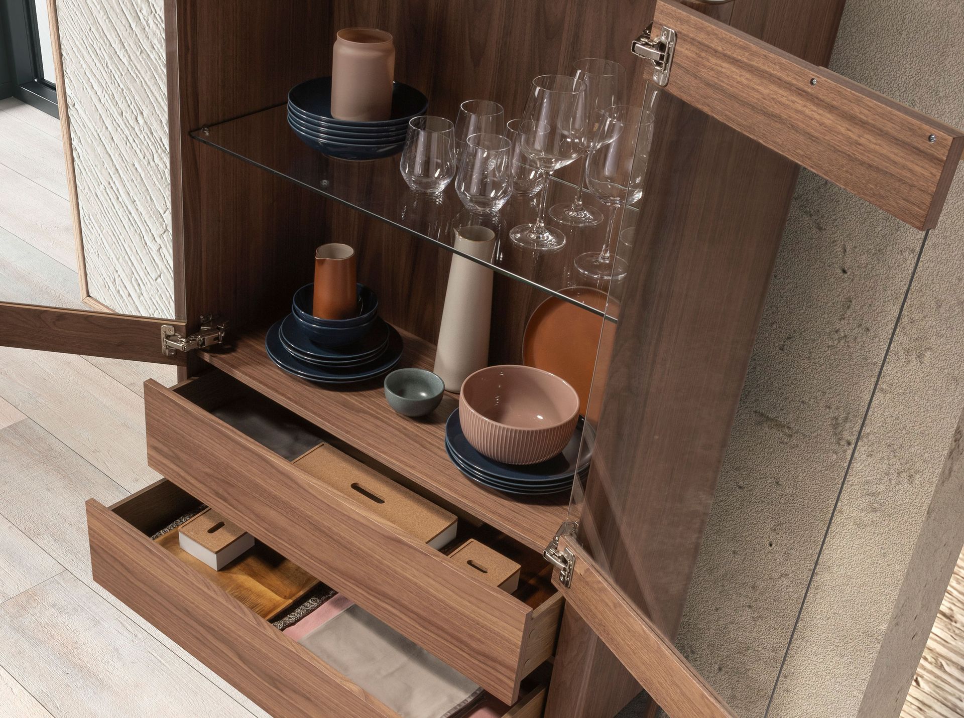 Aparador alto nogal con tapa de cristal imitación mármol e iluminación interior modelo 3075 Angel Cerdá S.L.Aparador alto de diseño moderno con estructura de madera chapada en nogal natural y unas originales patas de madera chapada en nogal natural. La iluminación interior de este aparador alto le permitirá crear un ambiente cálido y relajado, a la vez que ofrece una mejor visión del interior del mueble. Gracias a su elegante tapa de cristal imitación mármol porcelánico color blanco con vetas grises en acabado brillo, conseguirá el look sofisticado que busca para sus estancias. Su original detalle en cristal templado aporta el toque de estilo ideal para tu salón. Cuenta con un amplio espacio de almacenaje con 2 cajones con sistema de apertura push and pull y cierre soft-closing, y 2 puertas con sistema de apertura tirador de lengüeta y cierre soft-closing. Medidas del producto: 99 x 40 x 161 cm.- Un aparador elegante y sofisticado de madera chapada en nogal natural de 0,5 mm de espesor con el que conseguirá el toque de modernidad y calidez que busca para su salón o comedor. – Versátil y funcional, su diseño permite que encaje en cualquier ambiente, convirtiéndose en un elemento clave de la decoración de su hogar. – Gracias a su balda de cristal extraíble y ajustable en altura, podrá disfrutar de un amplio espacio para guardar su vajilla o menaje de mesa. – Práctico y funcional, gracias a su espacio de almacenaje podrá mantener todo en su sitio, eliminando ruido visual en su salón o comedor. – Su diseño con puertas de cristal templado, lo convierte en un mueble auxiliar único, versátil y adaptable para diferentes espacios de su hogar.