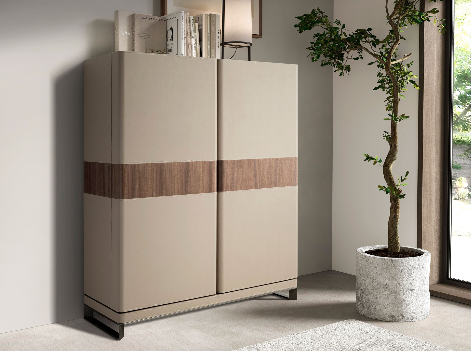 Aparador alto piel, nogal y acero pulido modelo 3276 Angel Cerdá S.L.Aparador alto de diseño moderno con estructura de madera chapada en nogal natural tapizada en piel de origen vacuno color visón y unas originales patas de acero inoxidable pulido. Cuenta con un amplio espacio de almacenaje con 3 cajones con sistema de apertura tirador de lengüeta y cierre soft-closing, y 2 puertas con sistema de apertura y cierre tirador de lengüeta. Medidas del producto: 120 x 50 x 150 cm.- El textil de este original aparador está tapizado en piel color visón, aportará el toque diferente y moderno que busca en su hogar. – El acero de sus patas, así como su diseño lineal, permite que encaje en cualquier espacio de su hogar. – Por su diseño de líneas rectas, aportará un aire de calma y calidez a cualquier estancia. – Este aparador ofrece amplio espacio de almacenaje gracias a sus baldas de madera y bandejas de cubertería extraíbles, diseñadas para mantener todo en orden y en su sitio. – Con una cuidada distribución interior que incluye estantes laterales, bandejas extraíbles, cajones, espacios modulares y compartimentos para botellas y copas, este aparador combina funcionalidad y estilo para mantener todo perfectamente organizado.