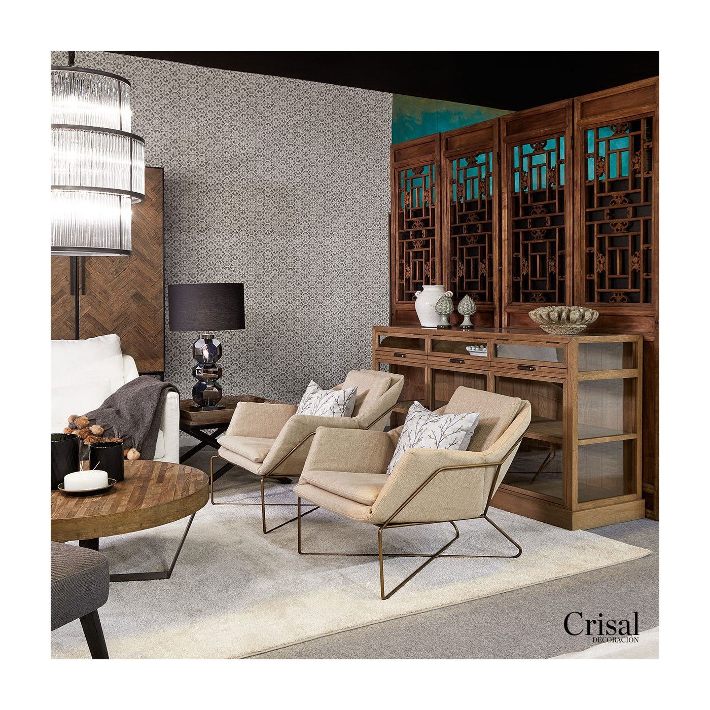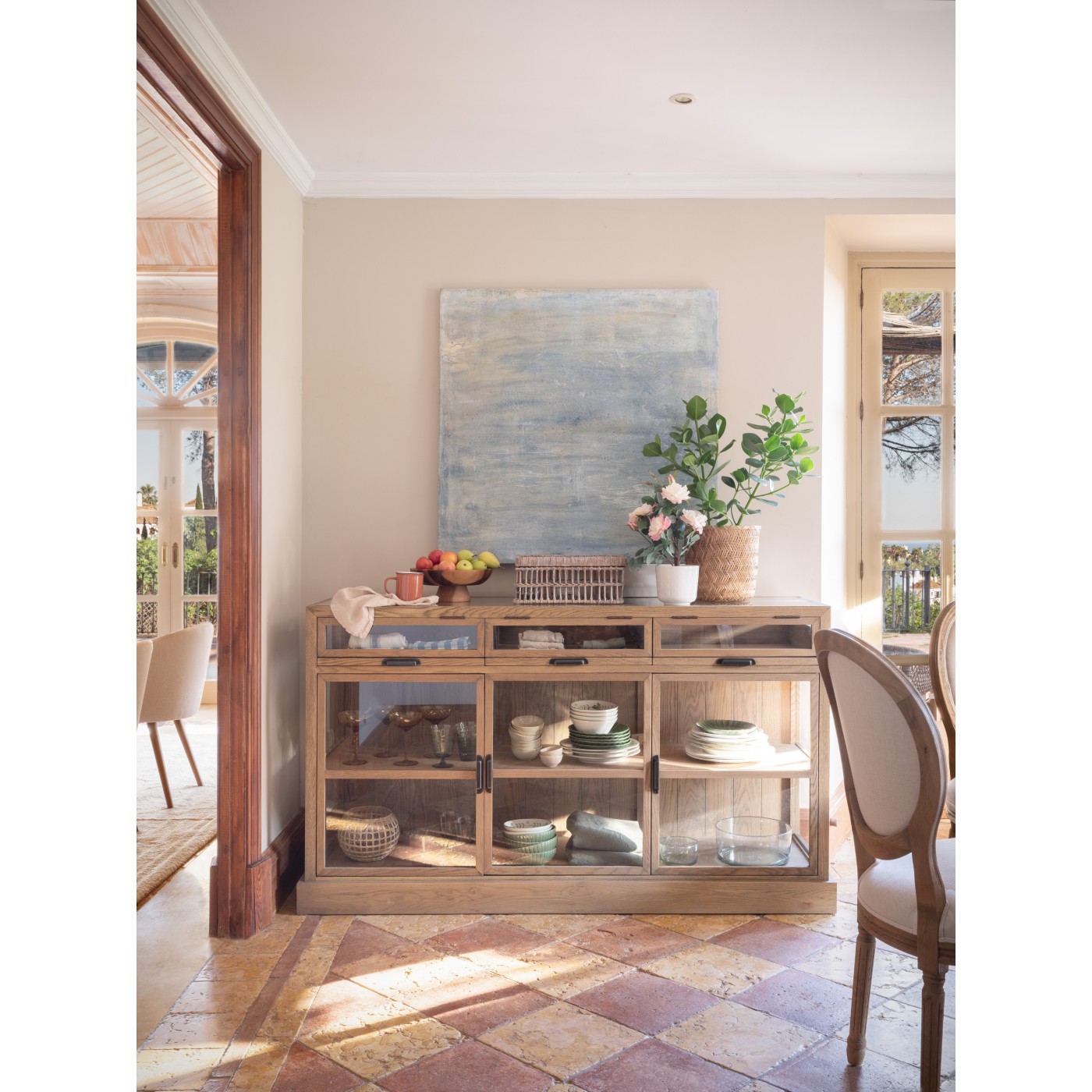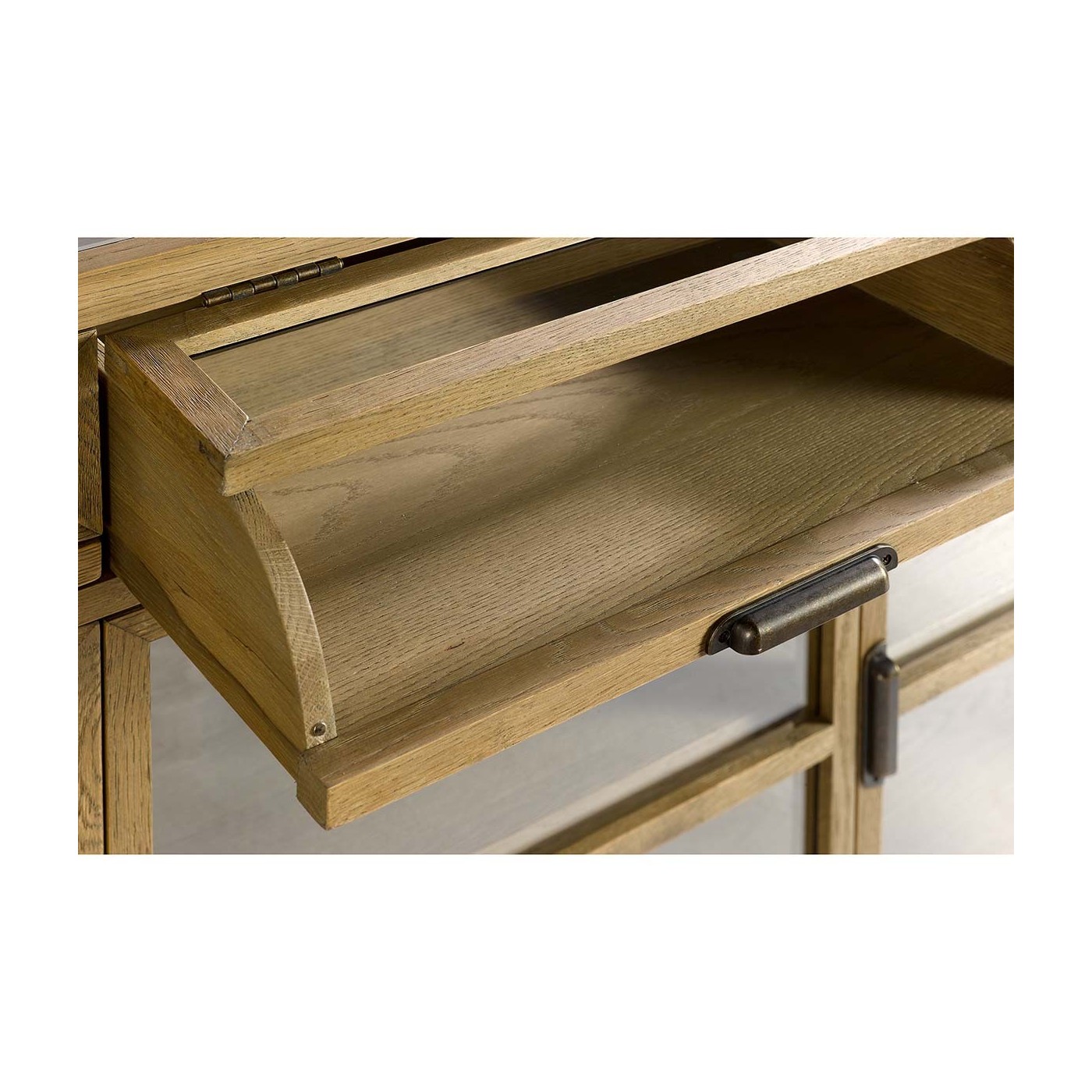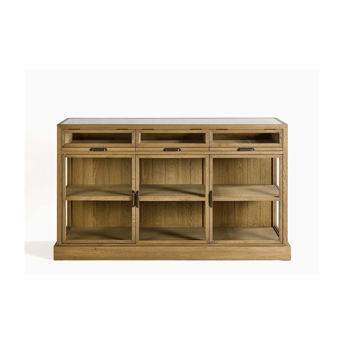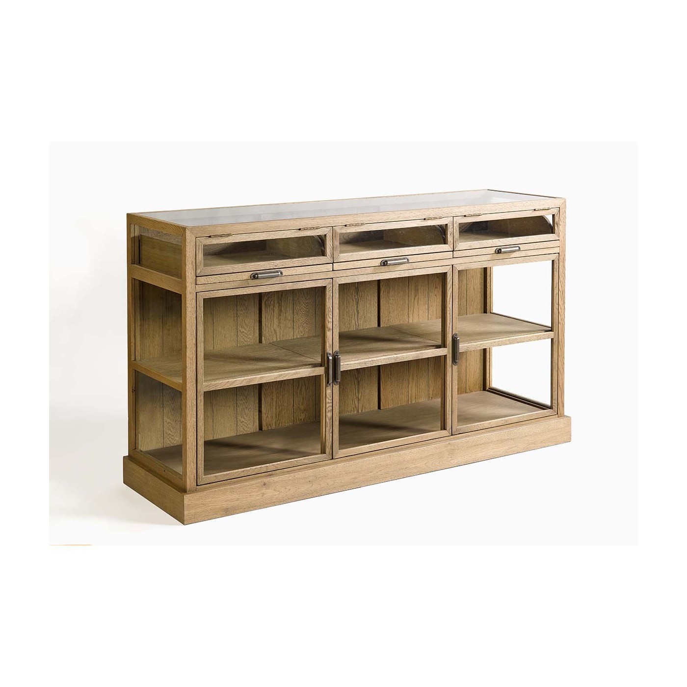 Aparador de madera de roble con acabado en cepillado natural. Este aparador es perfecto si necesitas un mueble con gran capacidad de almacenaje. Cuenta con tres cajoneras con el frontal acristalado, para que deposites objetos de pequeñas dimensiones o documentos