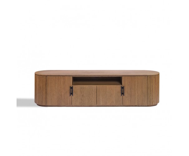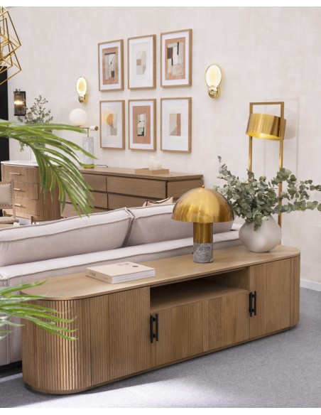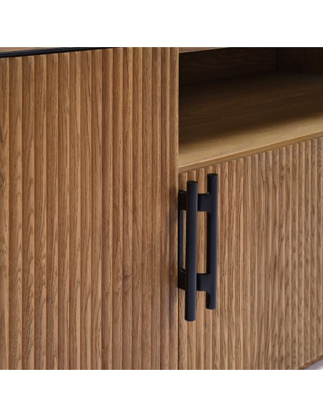 Aparador acabado en madera de roble con efecto palillería. tiradores metálicos y esquinas redondeadas. Un diseño en tendencia con un toque retro que dan a la estancia personalidad. Cuenta con gran capacidad de almacenaje.