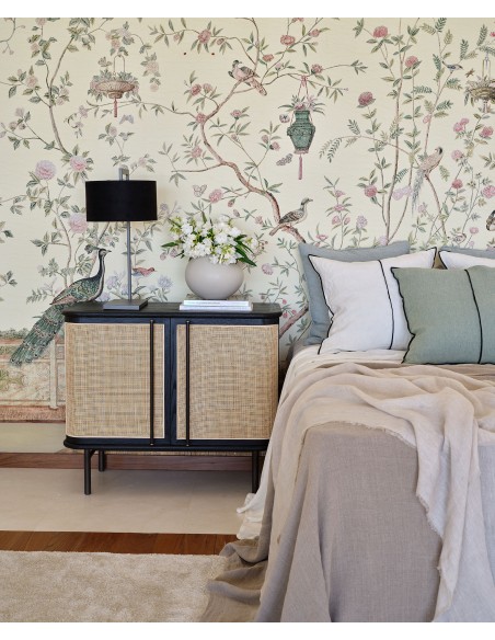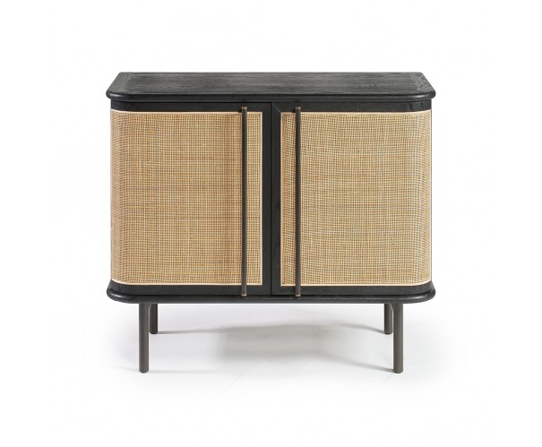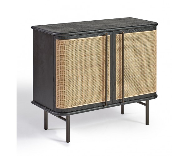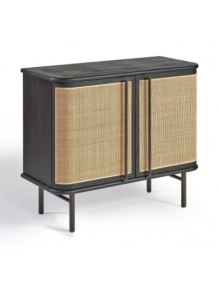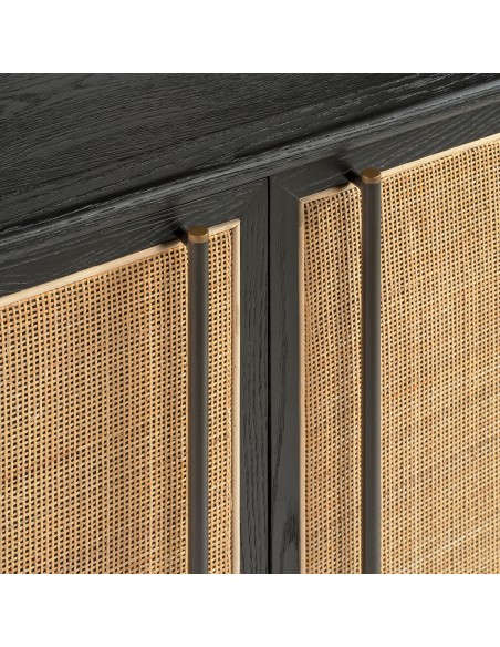 Aparador de dos puertas de madera de roble oscuro con detalles frontales de las puertas de ratán natural. Cuenta con una balda para almacenaje en su interior. Dimensiones: 102,4x45x86