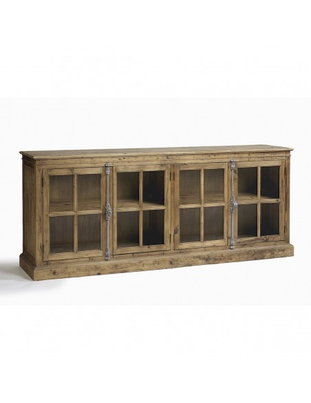 Aparador de pino reciclado que opta por una linea contemporánea. Posee cuatro puertas acristaladas. En su interior, se divide en dos partes gracias a una amplisima y larga balda permitiéndole ser un aparador muy espacioso. Ideal para vajillas, ropa del hogar o alimentos. Además, predomina por sus dos preciosos cierres tipo falleba de color grisaceo que harán aportandole a su hogar elegancia y personalidad.