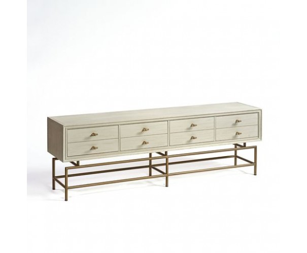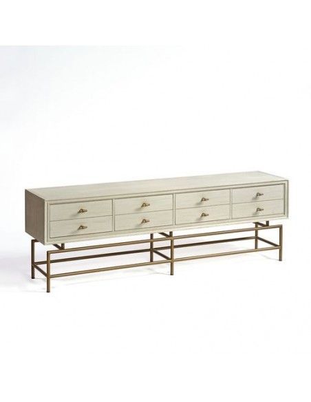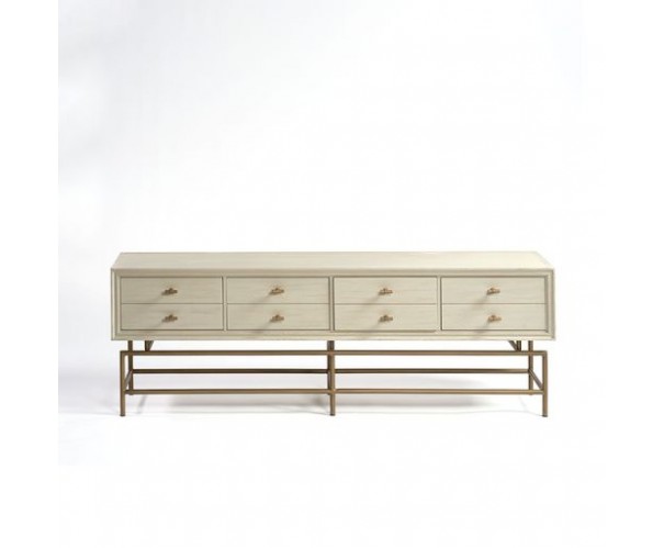 Aparador de televisión acabado en madera de roble color blanco grisáceo y patas metal dorado envejecido. Cuenta con 4 cajones que simulan 8 en diseño con tiradores en “T” en dorado envejecido. La pata está formada por tubo redondo. Puedes completar la decoración del salón con el aparador VITE-R2 o la consola VITE-R.