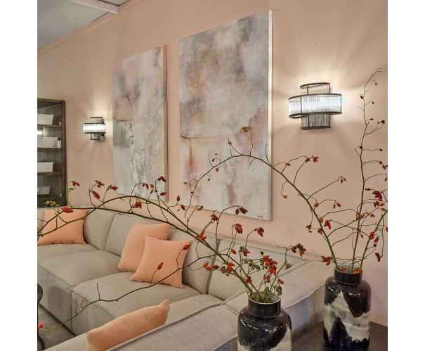 Aplique de pared con estructura metálica negra y pantallas con cilindros de cristal.