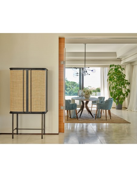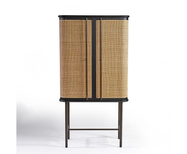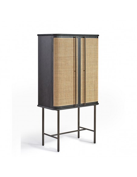 Armario de madera de roble en color oscuro con detalle frontal de puertas en ratán natural. Cuenta con dos baldas en su interior para aumentar su capacidad de almacenaje y organización. Dimensiones: 90x47x170