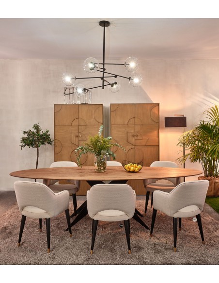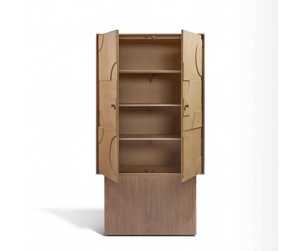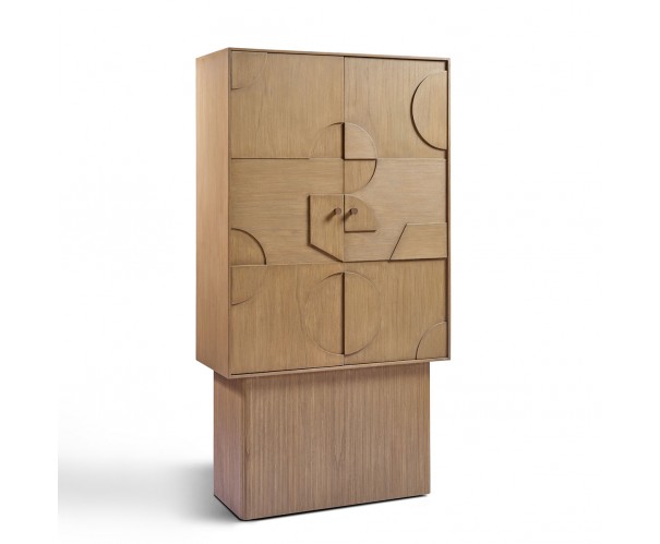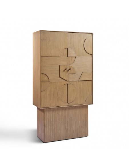 Armario de madera natural con dos puertas frontales con relieves geométricos. Una pieza original y contemporánea que no dejará indiferente a nadie en tu salón, entrada, sala de estar o comedor.