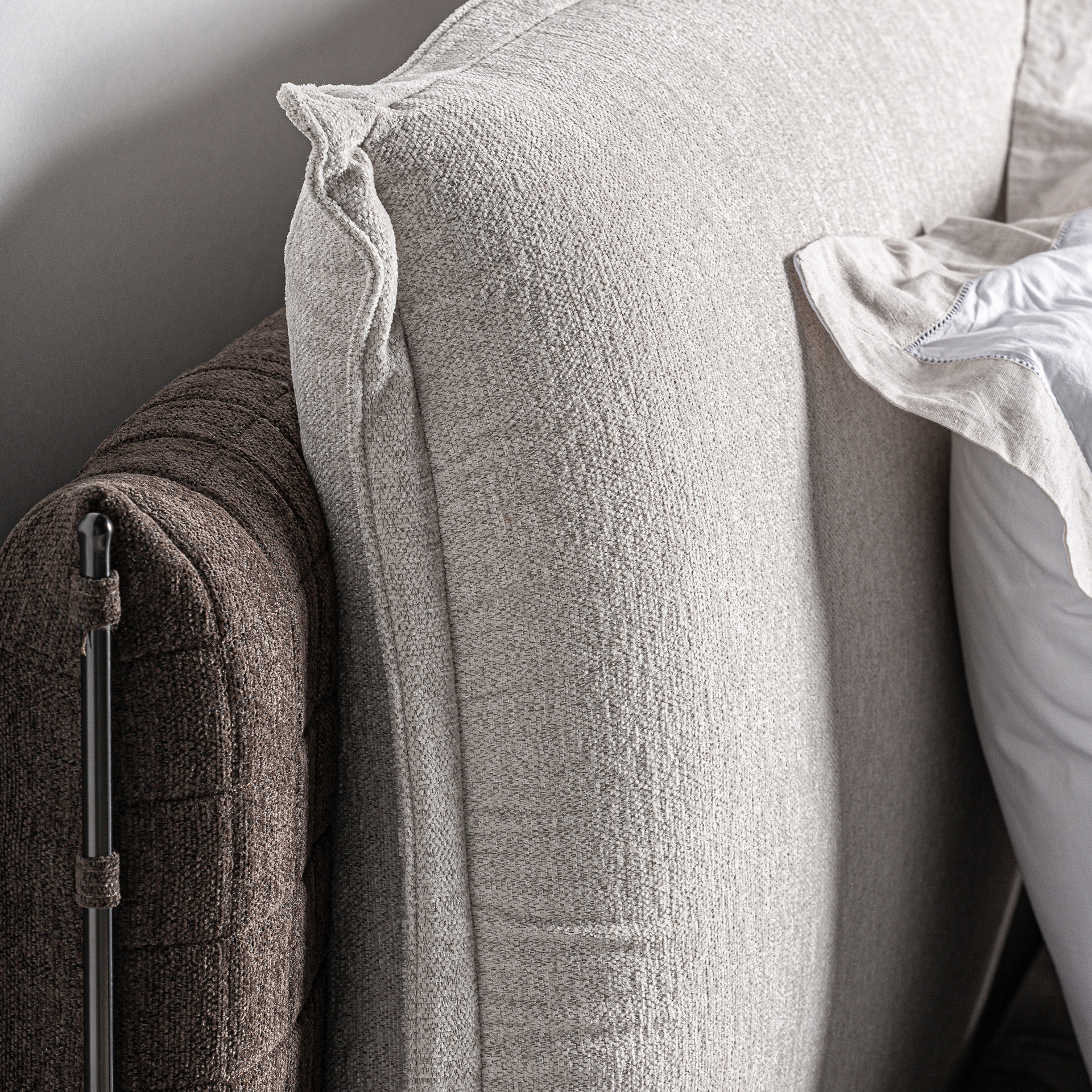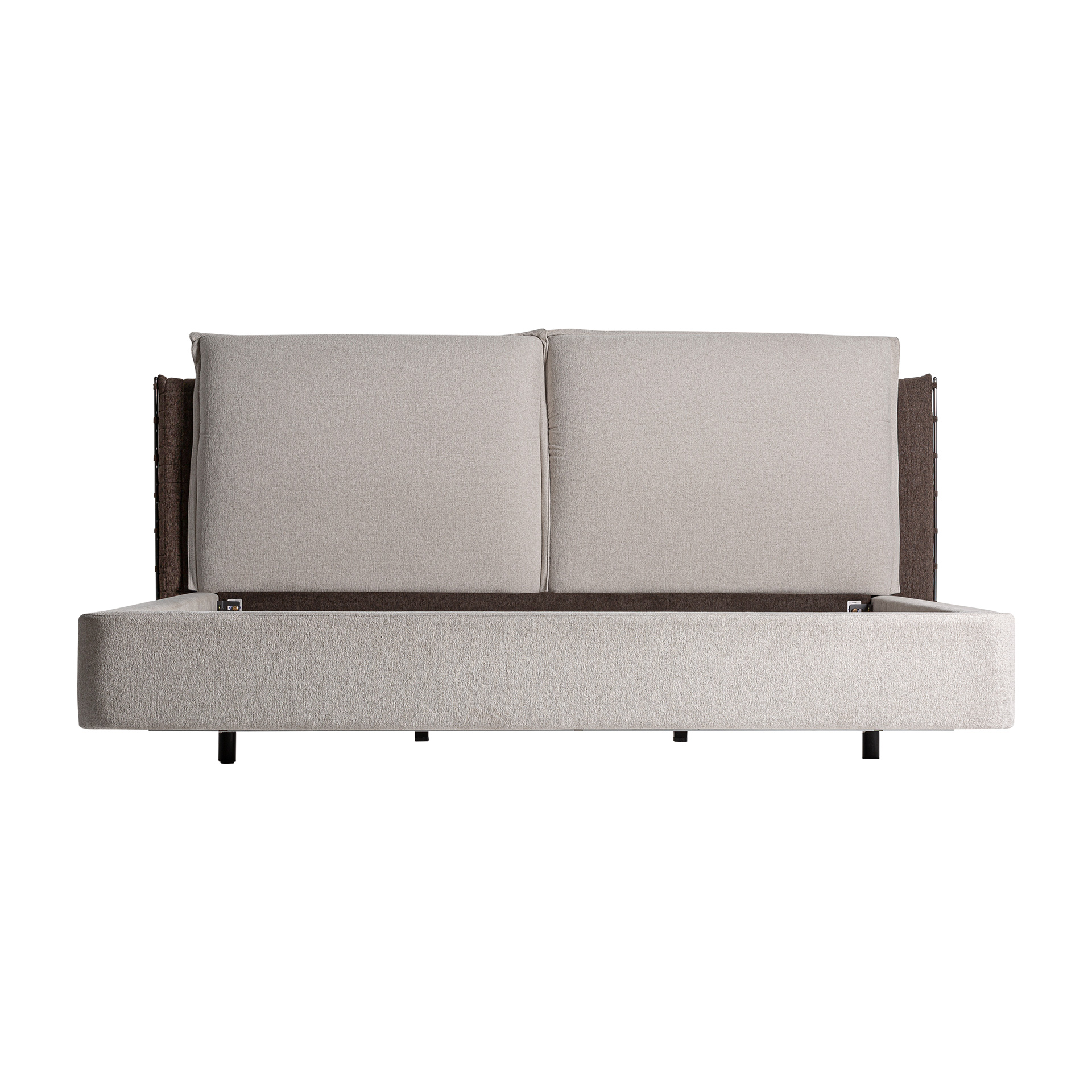 Cama Kioto de estilo contemporáneo fabricado en tela en color beige combinado con tela en color marrón con acabado oscuro y madera de pino en color marrón.