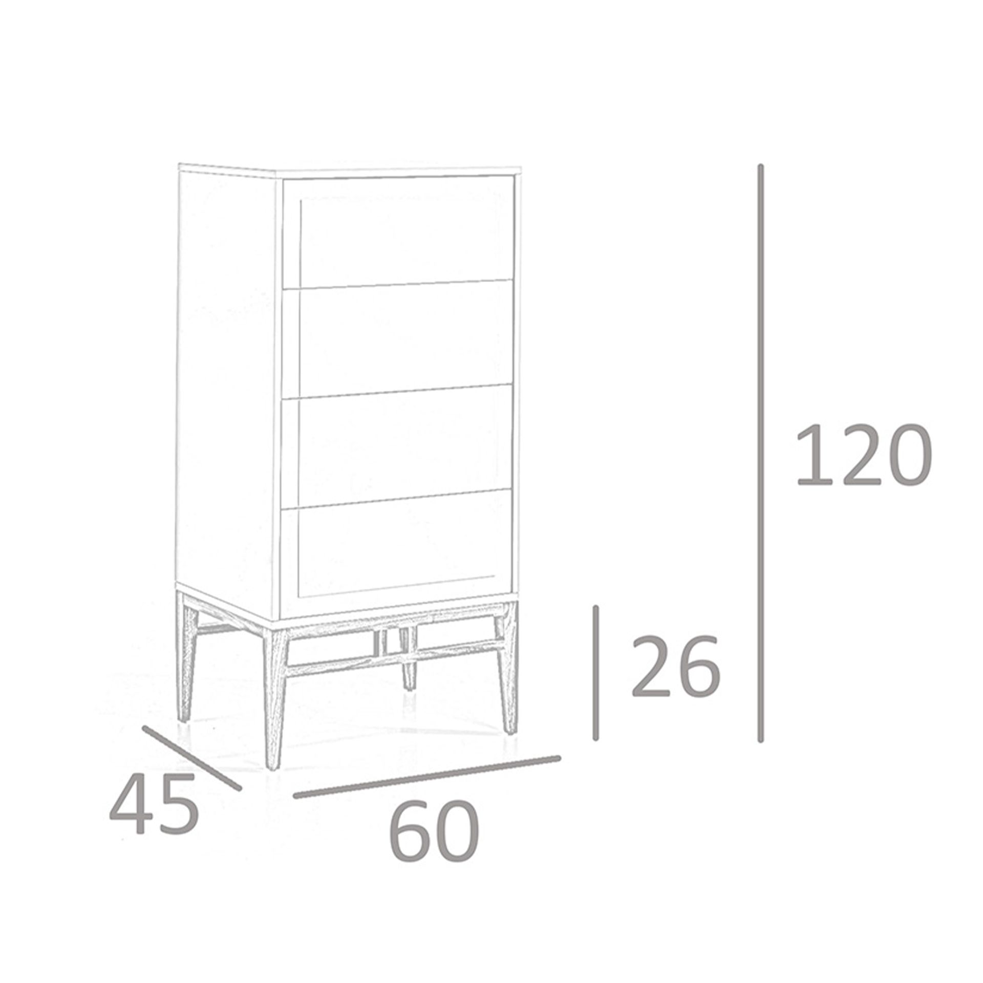 Chifonier madera beige y nogal modelo 7036 Angel Cerdá S.L.Chifonier de diseño moderno con estructura de madera de MDF color beige y unas originales patas de madera chapada en nogal natural. Cuenta con un amplio espacio de almacenaje con 4 cajones con sistema de apertura push and pull y cierre soft-closing. Medidas del producto: 60 x 45 x 120 cm.- Gracias a su acabado lacado, este chifonier es ideal para crear un ambiente con carácter y personalidad, sin dejar de lado la parte más funcional y práctica para el día a día. – La robusta estructura de patas de madera chapada en nogal natural aporta el toque de calidez. – Versátil y funcional, su diseño permite que encaje en cualquier ambiente, convirtiéndose en un elemento clave de la decoración de su hogar. – Gracias a sus baldas de madera, podrá disfrutar de un amplio espacio para guardar su vajilla o menaje de mesa. – Práctico y funcional, gracias a su espacio de almacenaje podrá mantener todo en su sitio, eliminando ruido visual en su dormitorio.