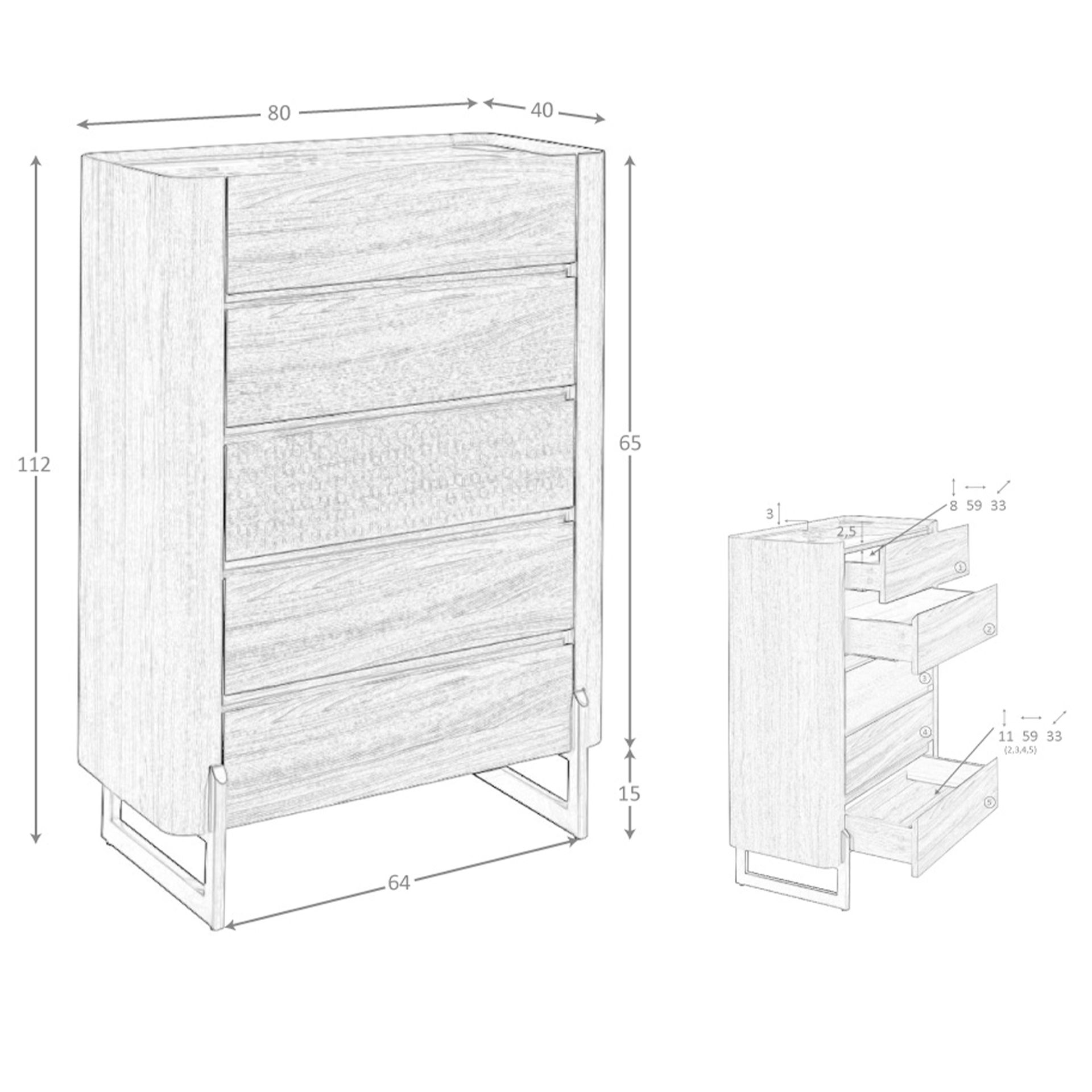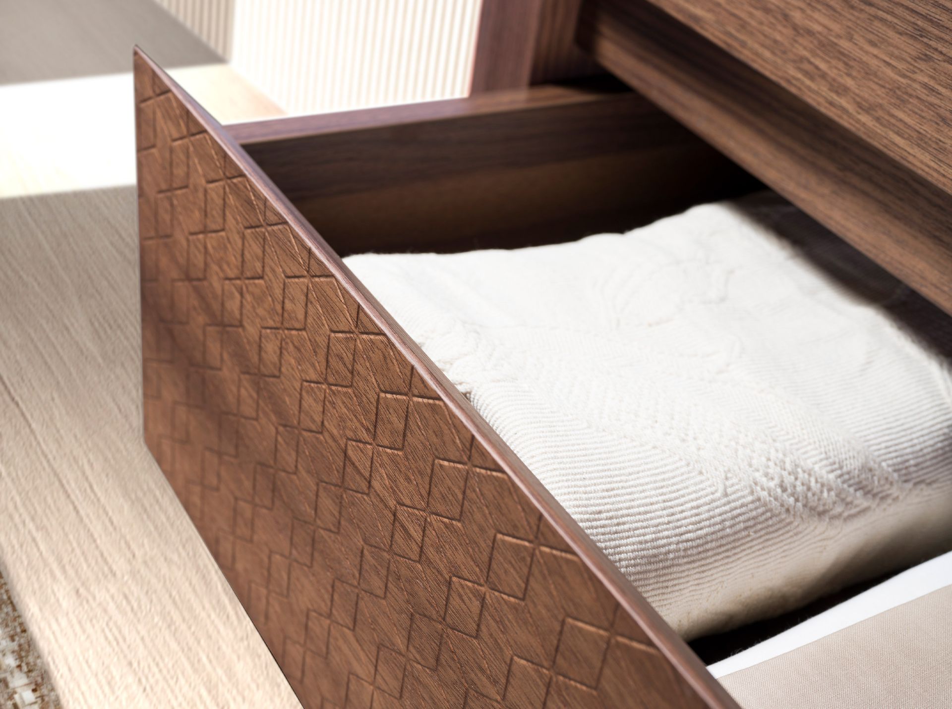 Chifonier nogal, acero visón metal y tapa de mármol porcelánico modelo 7153 Angel Cerdá S.L.Chifonier de diseño moderno con estructura de madera chapada en nogal natural y unas originales patas de acero inoxidable color visón metal. Gracias a su elegante tapa de mármol porcelánico blanco con vetas en tonalidades grises y marrones en acabado brillo, conseguirá el look sofisticado que busca para sus estancias. Cuenta con un amplio espacio de almacenaje con 5 cajones con sistema de apertura uñero y cierre soft-closing. Medidas del producto: 80 x 40 x 112 cm.- Este elegante mueble de madera chapada en nogal natural de 0,5 mm de espesor, aportará el toque diferente y moderno que busca para su hogar. – El acero de sus patas, así como su diseño lineal, permite que encaje en cualquier espacio de su hogar. – Fabricado en materiales nobles de la más alta calidad, cuenta con una tapa de mármol porcelánico blanco con un elegante diseño veteado en tonalidades tierra, lo que le confiere un diseño totalmente distintivo y de vanguardia. – Práctico y funcional, gracias a su espacio de almacenaje podrá mantener todo en su sitio, eliminando ruido visual en su dormitorio. – El original grabado con motivos geométricos en su cajón central, lo hace todavía más especial y único.