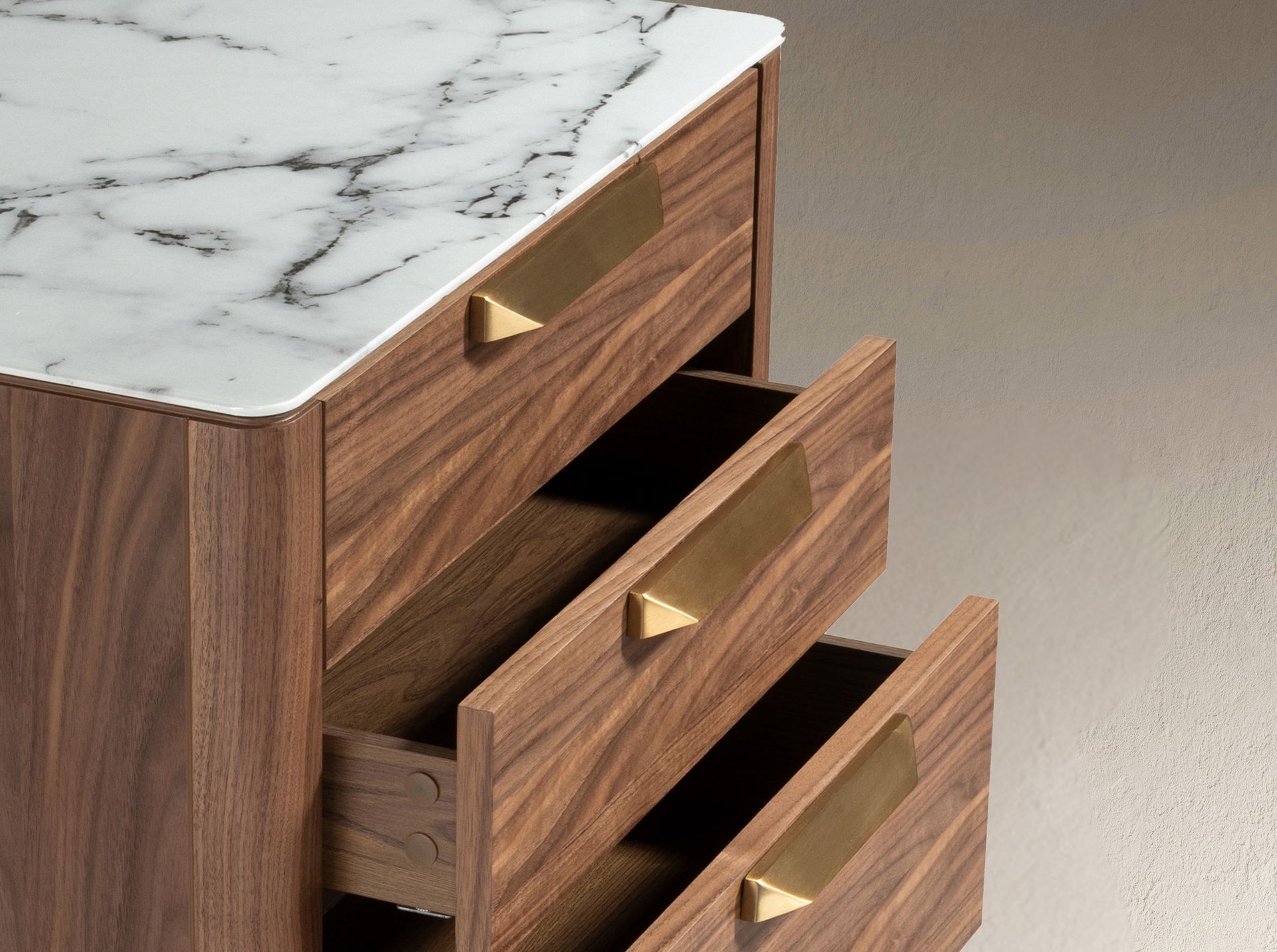 Chifonier nogal con tapa de cristal imitación mármol modelo 7039 Angel Cerdá S.L.Chifonier de diseño moderno con estructura de madera chapada en nogal natural y unas originales patas de madera chapada en nogal natural. Gracias a su elegante tapa de cristal imitación mármol porcelánico color blanco con vetas grises en acabado brillo, conseguirá el look sofisticado que busca para sus estancias. Cuenta con un amplio espacio de almacenaje con 5 cajones con sistema de apertura tirador de lengüeta y cierre soft-closing. Medidas del producto: 60 x 45 x 107 cm.- Un chifonier elegante y sofisticado de madera chapada en nogal natural de 0,5 mm de espesor con el que conseguirá el toque de modernidad y calidez que busca para su dormitorio. – Versátil y funcional, su diseño permite que encaje en cualquier ambiente, convirtiéndose en un elemento clave de la decoración de su hogar. – Práctico y funcional, gracias a su espacio de almacenaje podrá mantener todo en su sitio, eliminando ruido visual en su dormitorio.