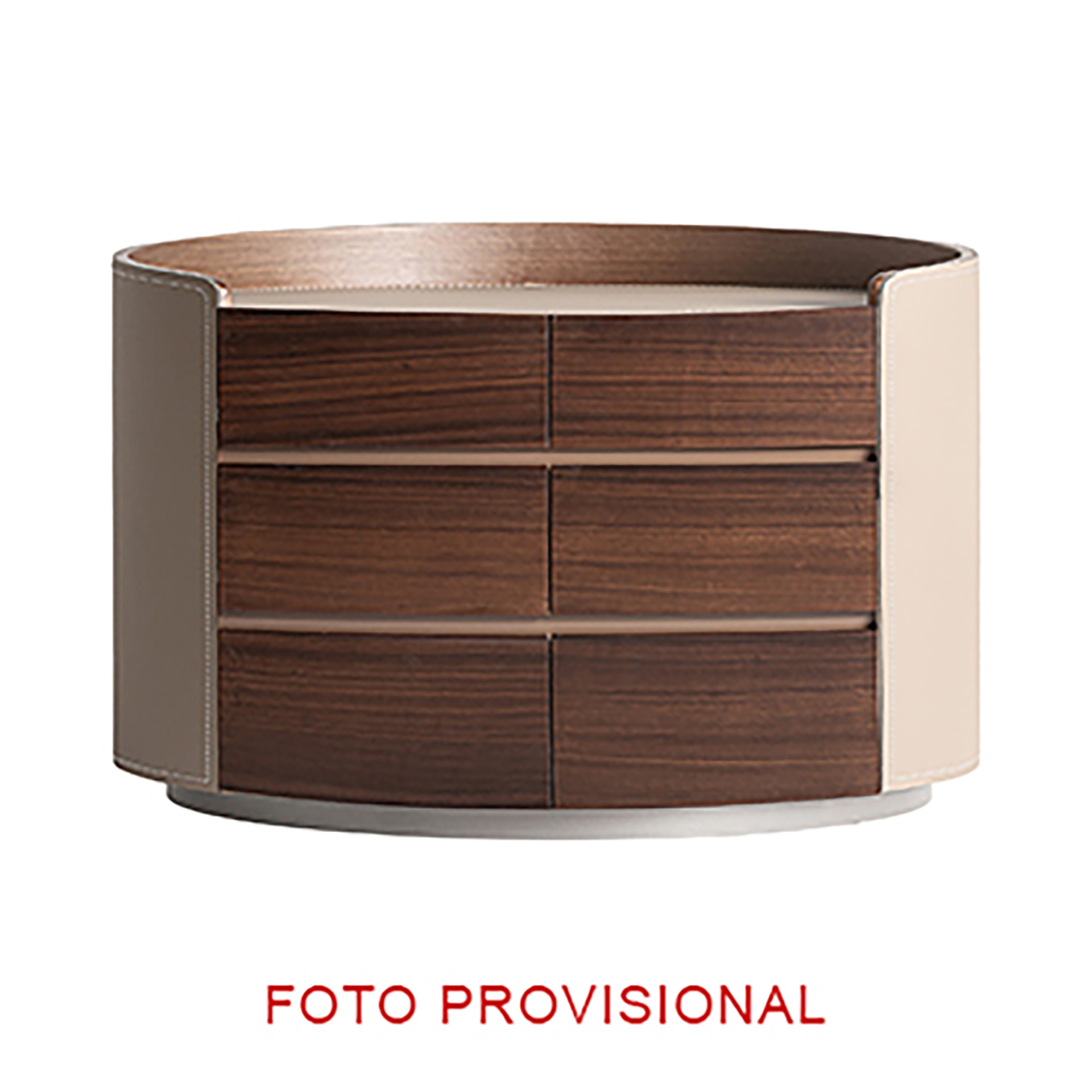 Cómoda fabricado en madera contrachapada en color marrón claro combinado con chapa de eucalipto y polipiel.