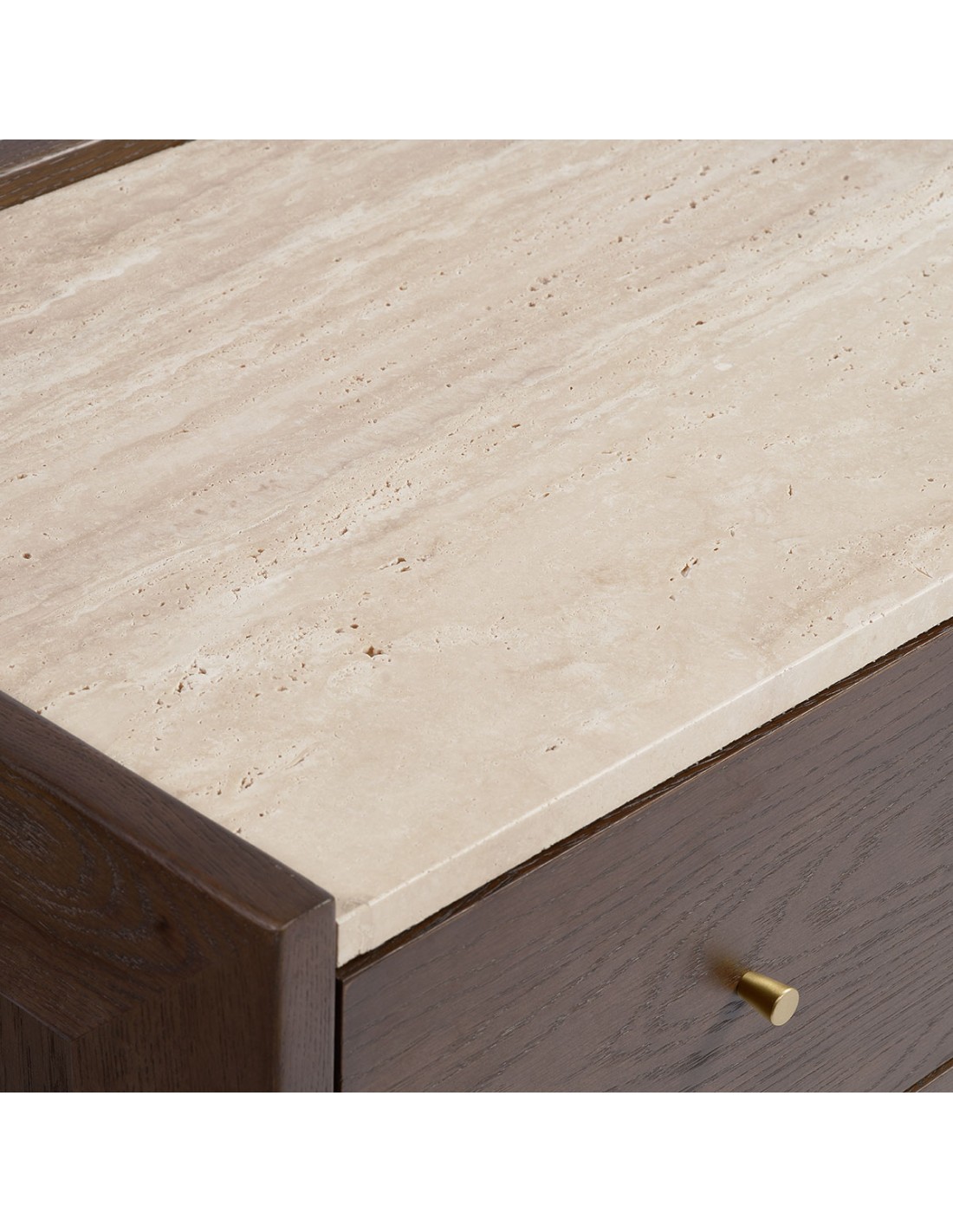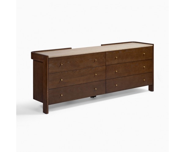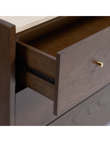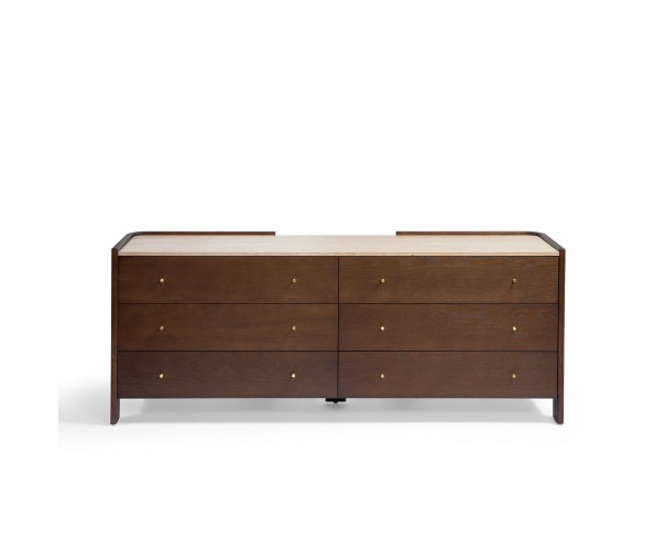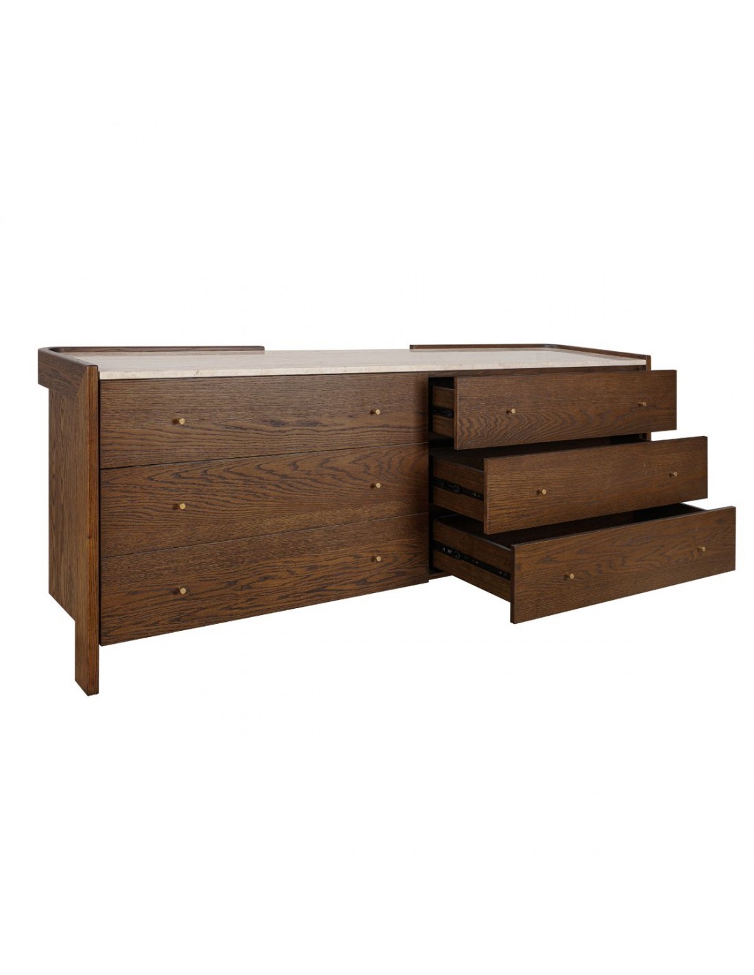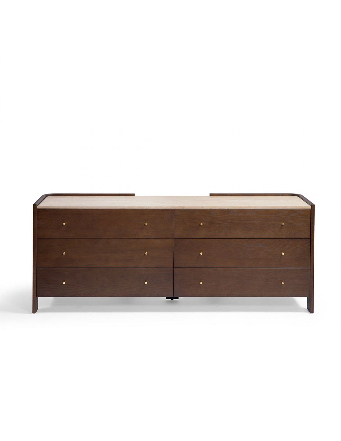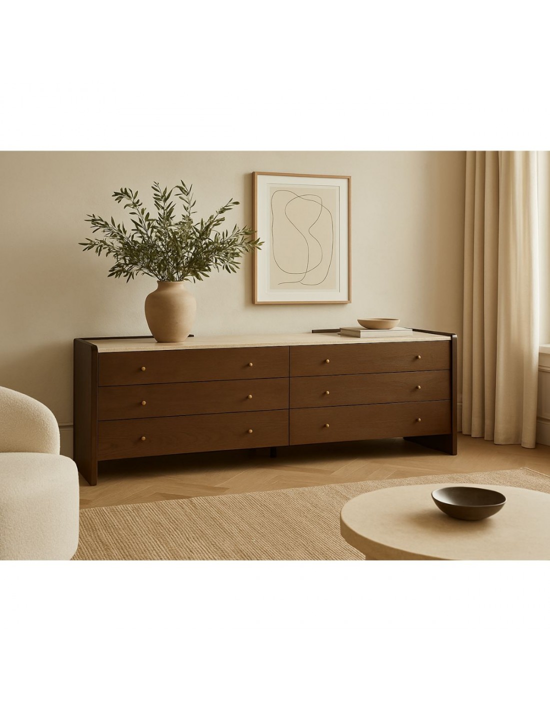 ¡Descubre nuestra nueva cómoda de diseño original. Esta pieza combina la calidez del roble marrón oscuro con la sofisticación del sobre de piedra blanca, destacándose por sus elegantes perfiles y laterales característicos. Con seis amplios cajones, ofrece una capacidad excepcional para almacenamiento. Ideal para decoradores exigentes, interioristas creativos y tiendas de decoración que buscan productos distintivos. Nuestros muebles se distinguen por acabados artesanales impecables, materiales naturales y diseños versátiles que definen el lujo contemporáneo. Descubre cómo esta cómoda eleva cualquier espacio con su estilo y funcionalidad únicos.