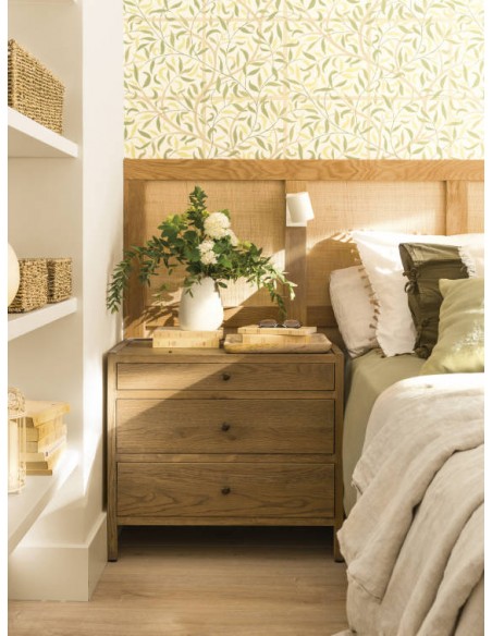 Cómoda de madera acabado en roble color natural con pátina gris y con 3 cajones. Cada cajón cuenta con un tirador central y la estructura está suspendida sobre 4 patas de la misma madera.