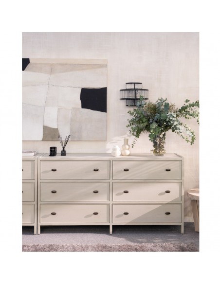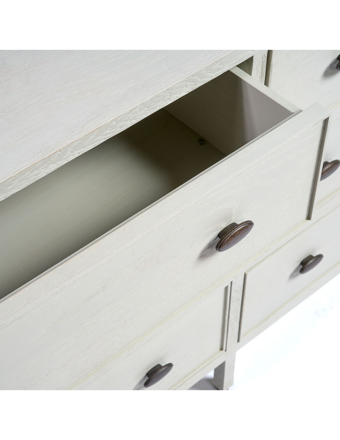 Comoda acabada en madera de roble color blanco grisáceo. Es una pieza perfecta para el dormitorio gracias a su gran capacidad de almacenaje. Un diseño minimalista pero con un toque de detalles muy personales que hacen que se adapte perfectamente a varios estilos decorativos. NOTA: El color puede variar en función de la luz recibida. La tonalidad es un blanco grisáceo. En estancias con más luz natural se apreciará un tono más claro y en zonas con menos luz natural la tonalidad irá a más gris.