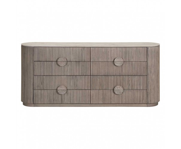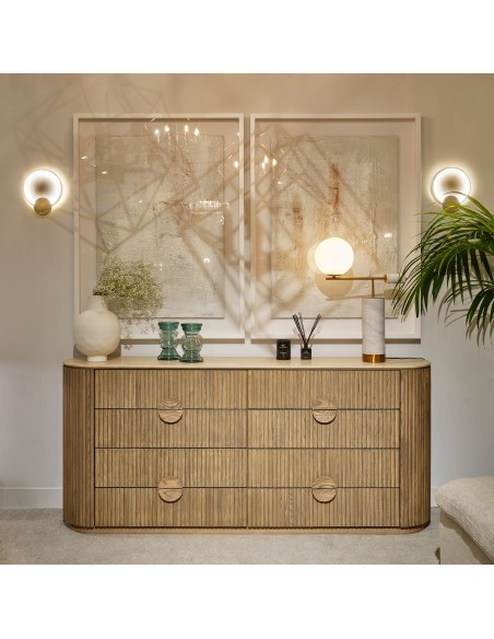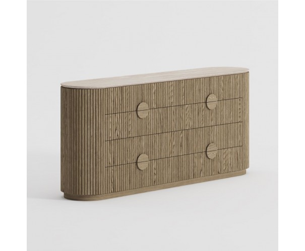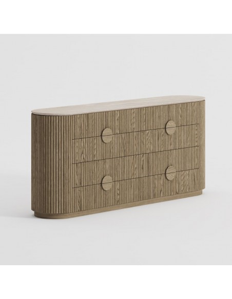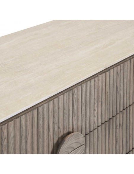 Cómoda de palillería en fresno claro combinado con un sobre de travertino beig. Ideal para combinar con la mesita de noche Nel-2-nat.
