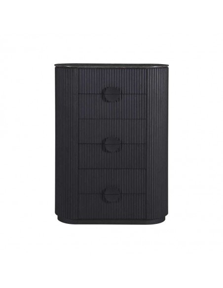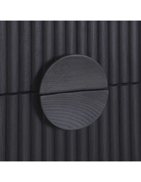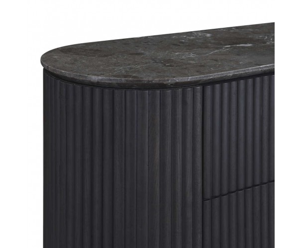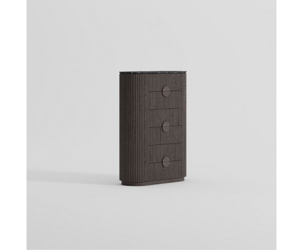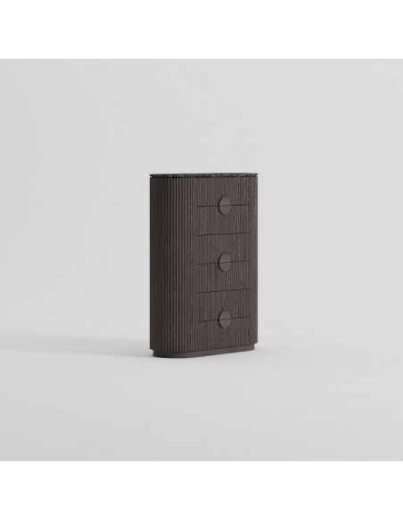 Cómoda de palillería en fresno oscuro combinada con mármol gris mate.