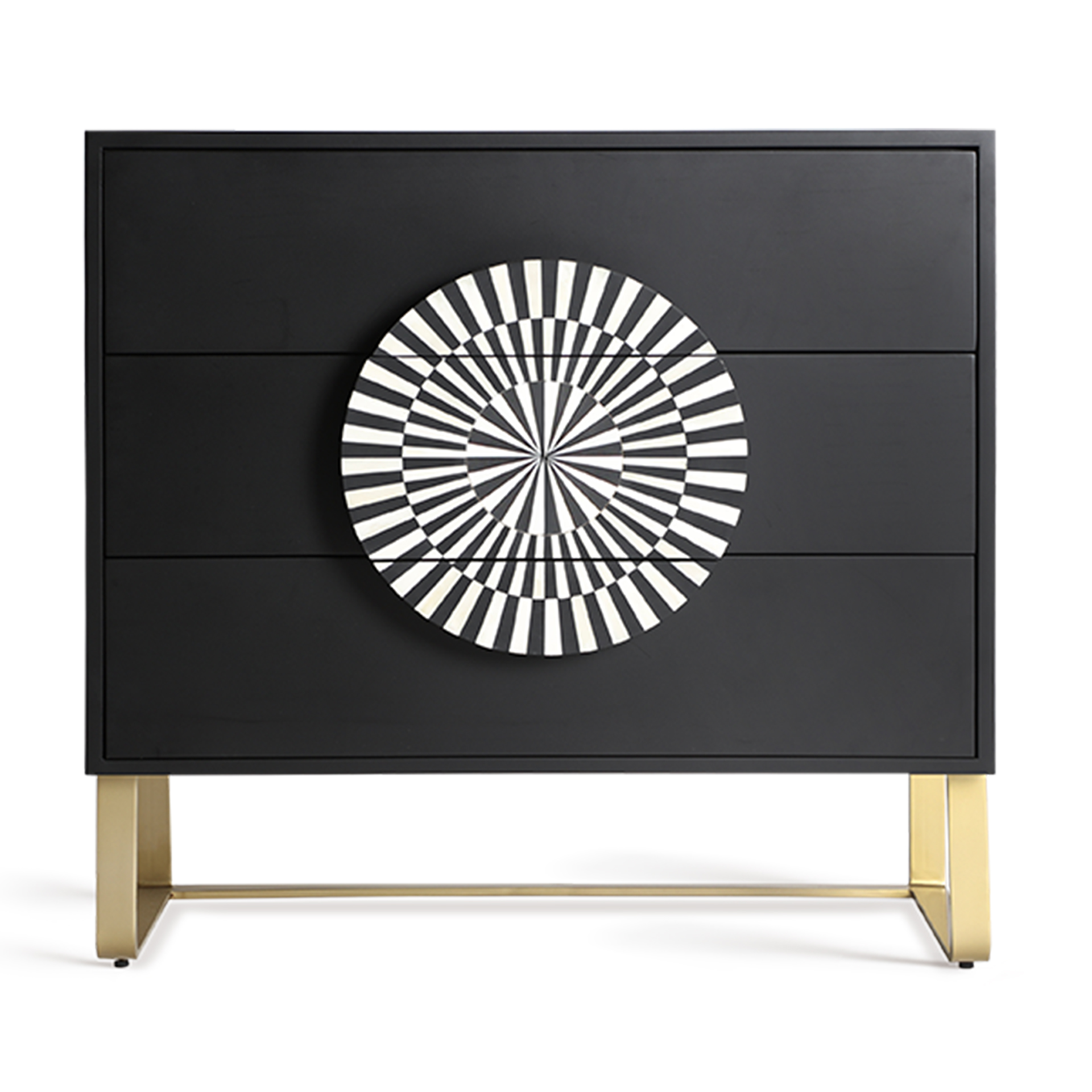 Cómoda gatsby de estilo art deco fabricado en madera dm en color negro combinado con hueso en color blanco y hierro en color oro.