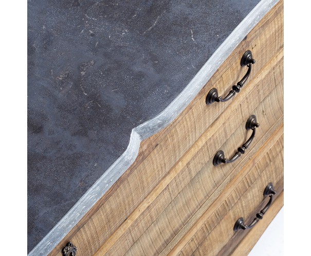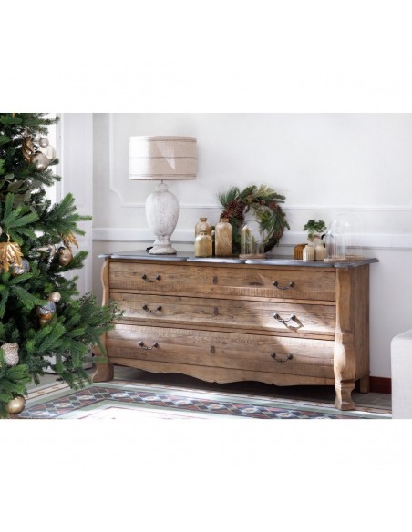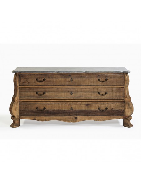 Cómoda original de madera de pino y tablero de piedra en la parte superior. Esta maravillosa cómoda te ofrece todo el refinamiento de un mueble de estilo XVIII combinado con la sobriedad de un mueble contemporáneo. Esta cómoda de madera de pino ligeramente envejecida aportará distinción a tu interior y resultará idónea. Conjuga elegancia y refinamiento. Líneas dinámicas, con patas originales, curvadas y tablero de piedra son otros tantos detalles que revelan un trabajo artesanal sútil y auténtico. Tiradores envejecidos de latón antiguos son sobrios y realzan las lineas pura de esta gama.