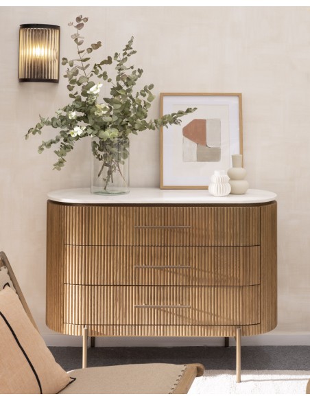 Cómoda ovalada con 3 cajones y estructura de madera de roble acabado natural, tiradores y patas de metal en tono dorado envejecido y sobre de piedra color blanco. Un diseño de cómoda para dormitorio, recibidor o espacio de almacenaje con toques de estilo retro. Cómoda con líneas curvas y sencillas y efecto palillería que la actualizan en tendencia y la hacen muy original.