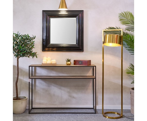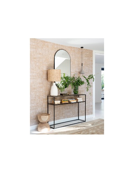 Consola de madera de roble con estructura metálica. Este modelo es sencillo y elegante con un toque industrial. Se adapta tanto a ambientes más industriales como aquellos más modernos y sofisticados. Su balda intermedia permite poder usar para mayor almacenaje u objetos decorativos