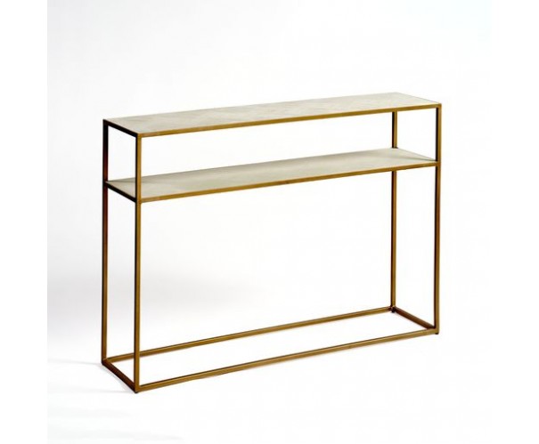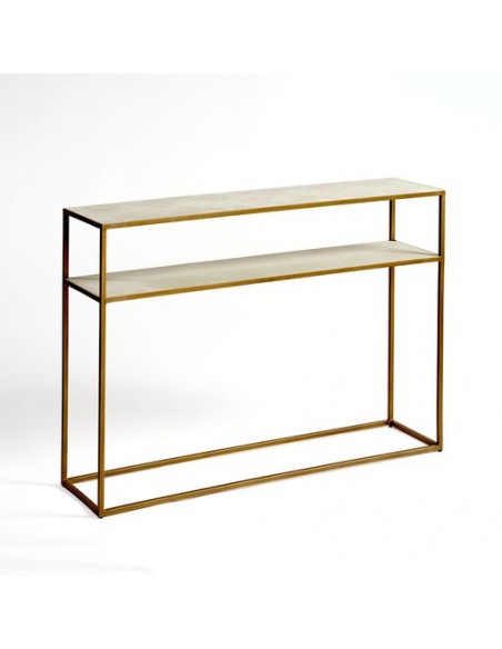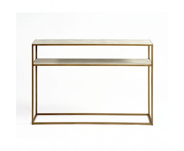 Consola de madera de roble en acabado blanco grisáceo con estructura metálica en dorado. Este modelo es sencillo y elegante con un toque industrial. Se adapta tanto a ambientes más industriales como aquellos más modernos y sofisticados. Su balda intermedia permite poder usar para mayor almacenaje u objetos decorativos. Dimensiones: 120x30x85