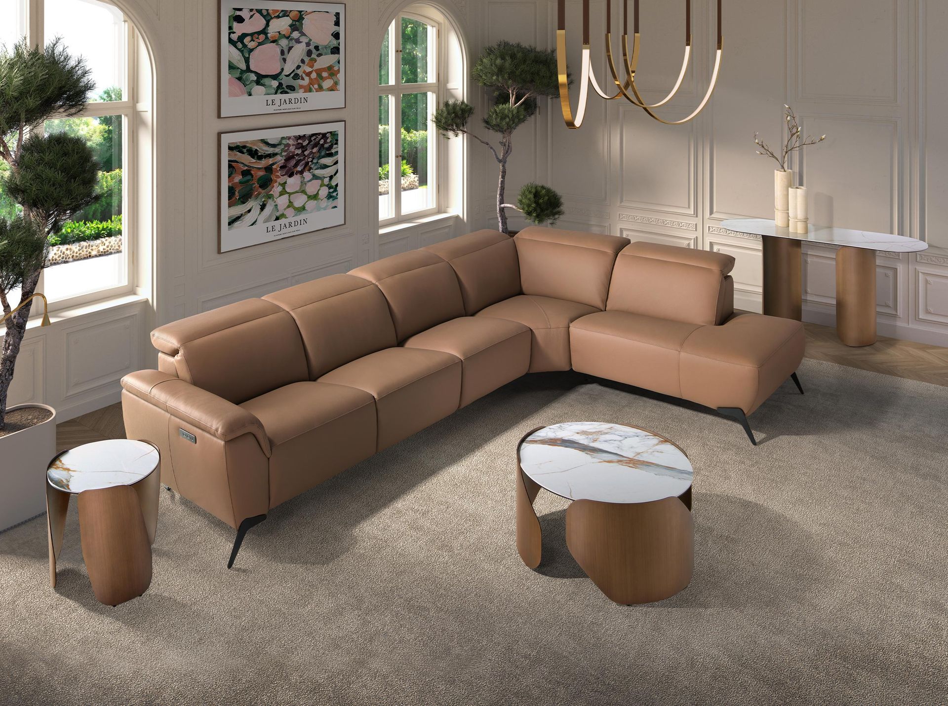 Consola ovalada medio punto mármol porcelánico y acero color bronce
