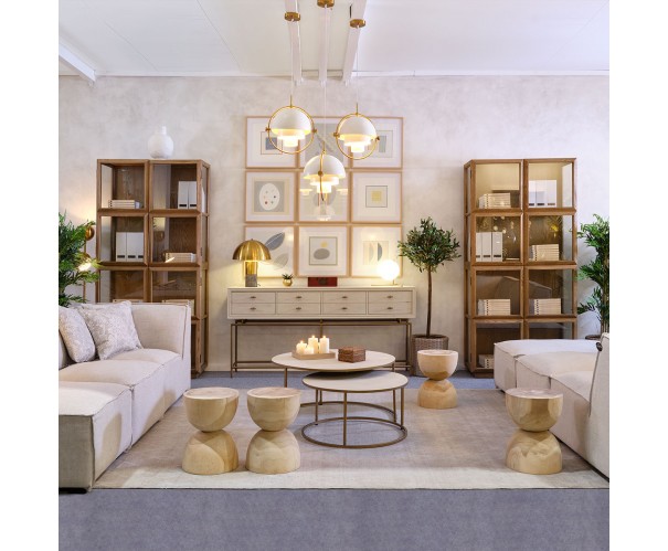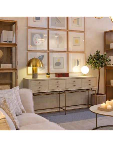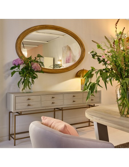 Consola con cajones de madera y metal. Consola acabada en roble blanco grisáceo con estrucutra metálica y tirador en forma de “T” en color dorado envejecido. Cuenta con 4 cajones cuyo frontal simula tener cajones separados. Estructura de metal con tubo redondo.