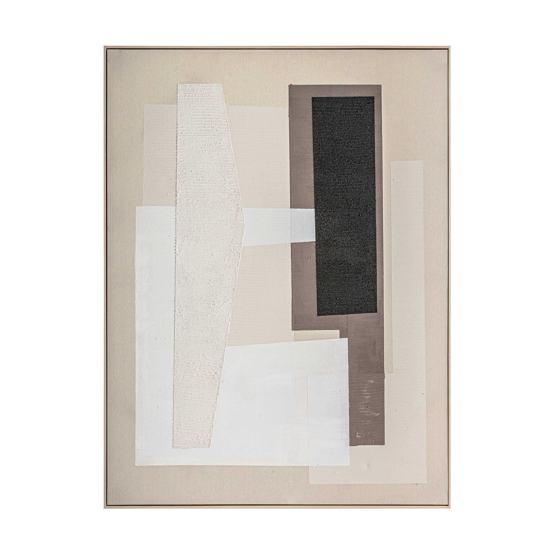 Cuadro Nexo de estilo contemporáneo, fabricado en lienzo en color tonos neutros con acabado artesanal, combinado con madera de pino en color marrón claro.