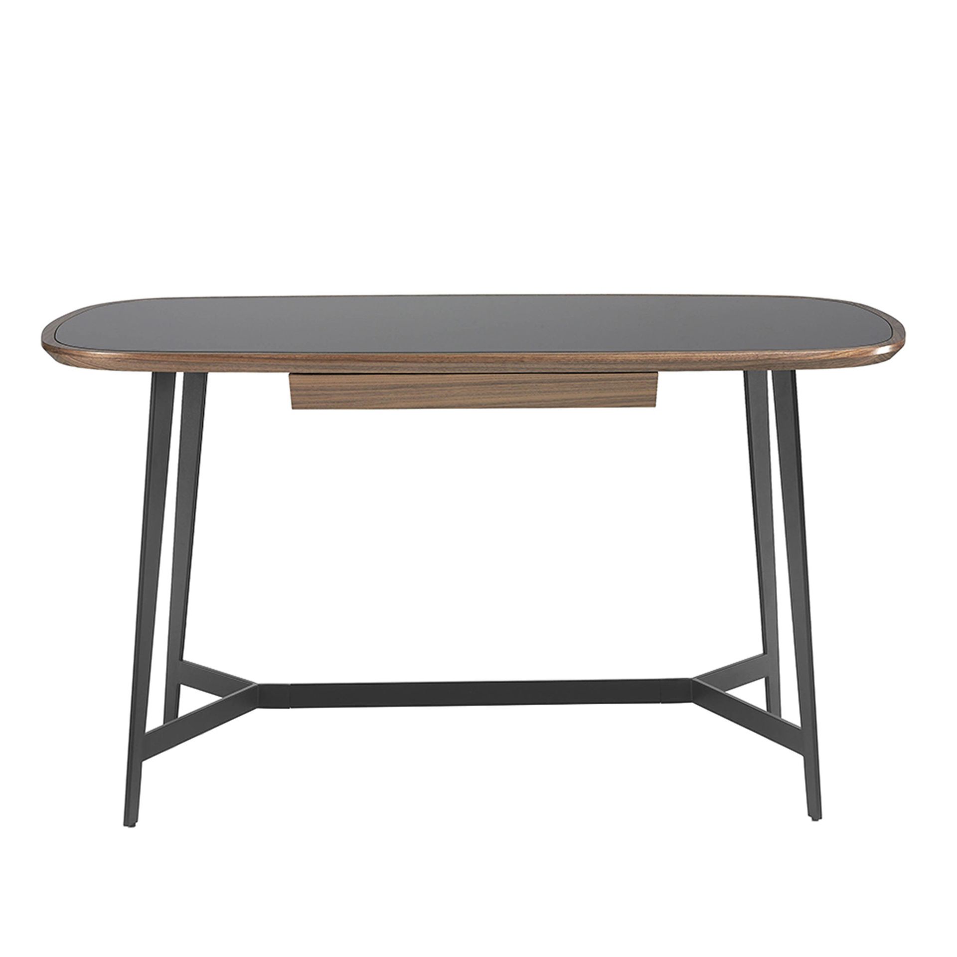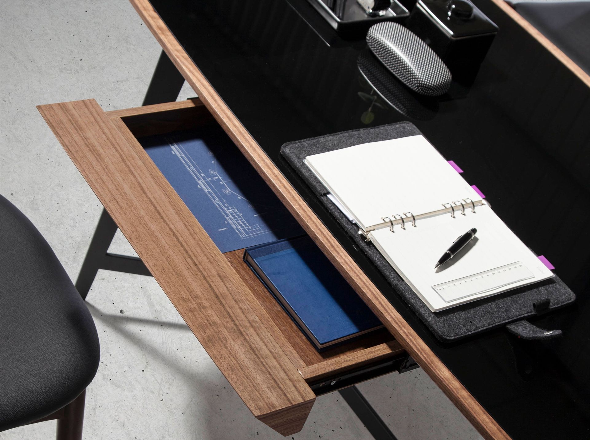 Escritorio nogal y acero negro con tapa de cristal negro modelo 3137 Angel Cerdá S.L.Escritorio de diseño moderno con tapa de cristal templado tintado en color negro y estructura de madera chapada en nogal natural. El diseño de sus patas de acero inoxidable pintado en epoxi negro aportará un toque sofisticado y exclusivo a su estancia. Gracias a su amplio espacio de almacenaje con 1 cajón con sistema de apertura uñero y cierre soft-closing, le permitirá mantener todo en orden y en su sitio. Medidas del producto: 140 x 72 x 76 cm.- Tanto por su diseño como por su tapa de cristal templado color negro, este escritorio aportará amplitud y elegancia a su oficina, convirtiéndolo en una pieza clave en la decoración de su zona de trabajo. – Fiel a las últimas tendencias en decoración, el acero negro le permitirá crear un espacio único, personal y con carácter. – Todos nuestros productos están fabricados con materiales de la más alta calidad, siendo además un elemento versátil y funcional para su zona de trabajo o vestidor. – Gracias a su cajón central, cuenta con espacio de almacenaje para poder guardar todo lo que necesite tener a mano para su día a día, manteniendo así el orden visual en la habitación.