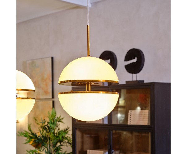 Lámpara colgante de metal dorado y cristal blanco. El globo presenta una abertura en la parte media. Un diseño elegante para tu entrada, salón o distribuidor