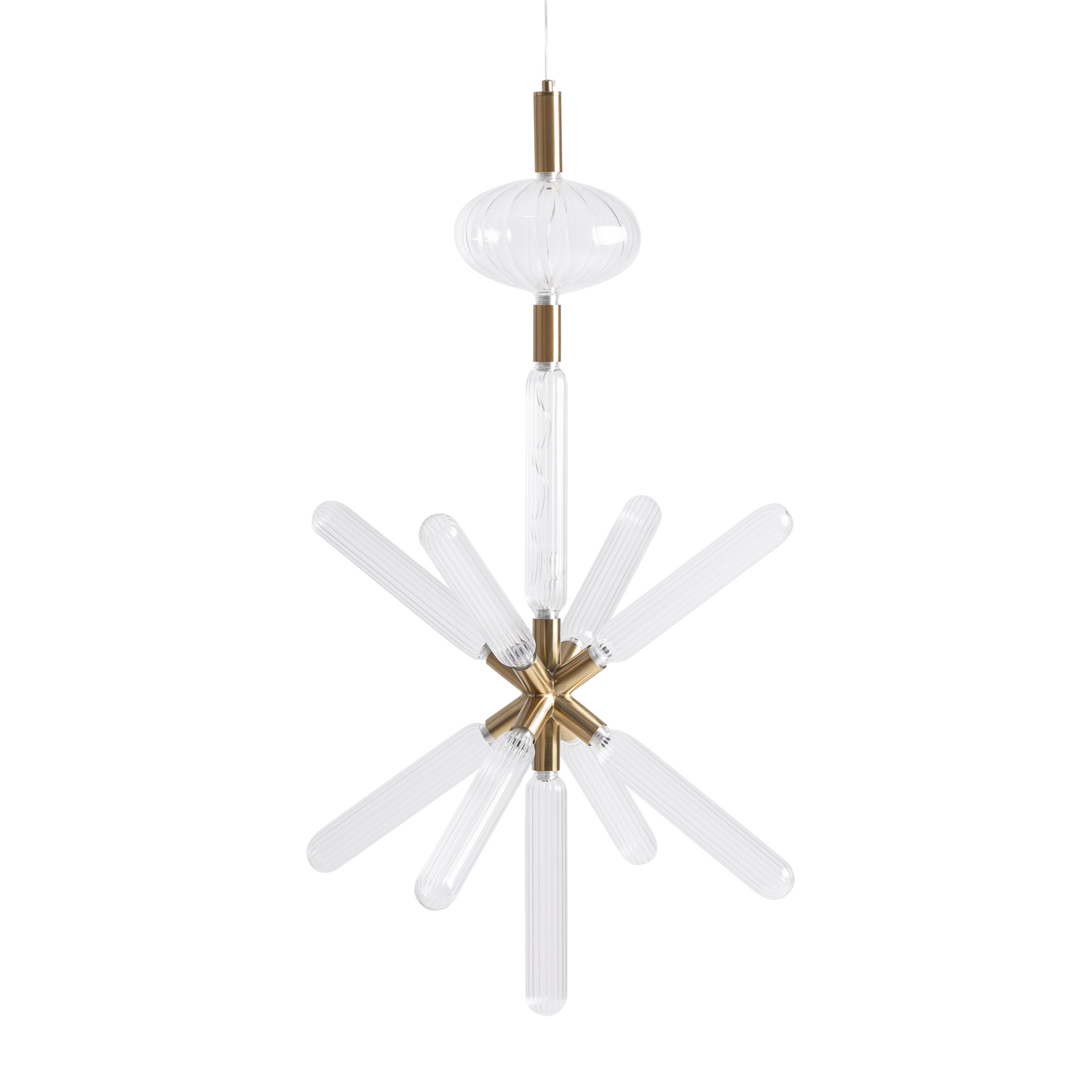 Lámpara de colgar fabricado en cristal en color transparente combinado con acero en color bronce.
