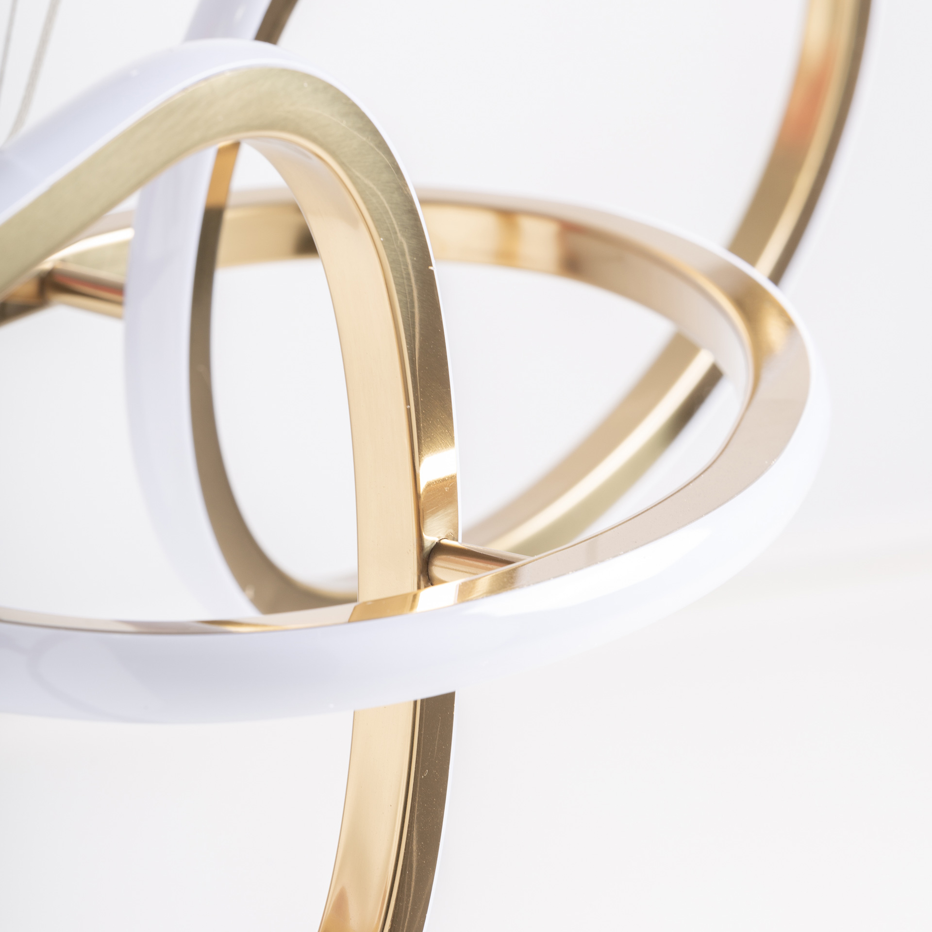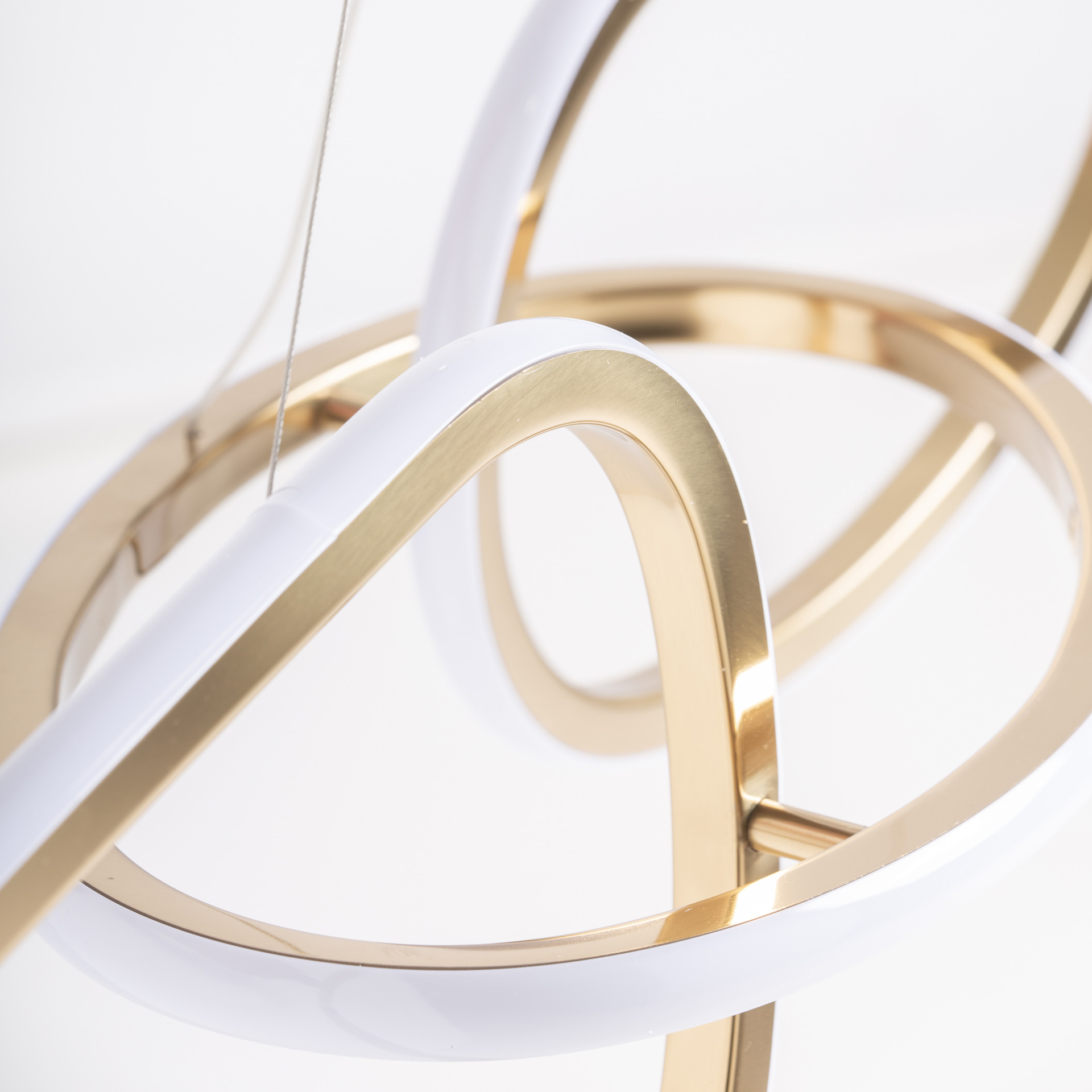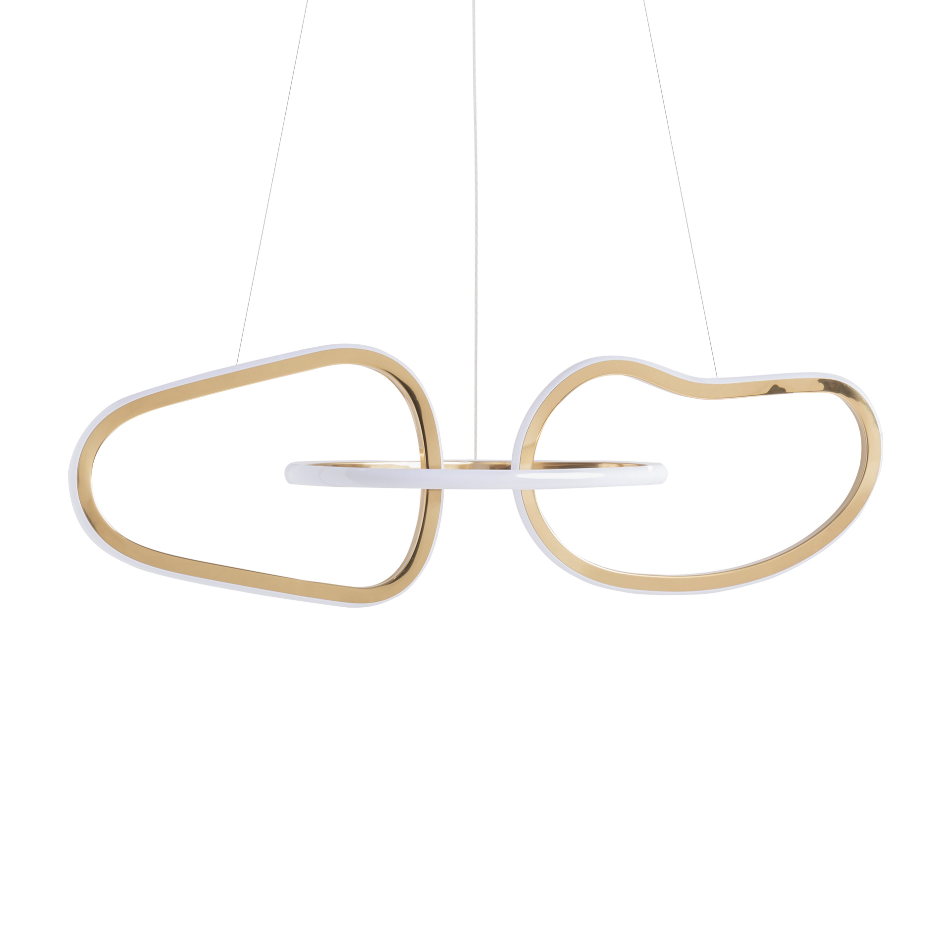 Lámpara de colgar Kaleshe de estilo art deco fabricado en acero inoxidable en color dorado combinado con cristal en color blanco.