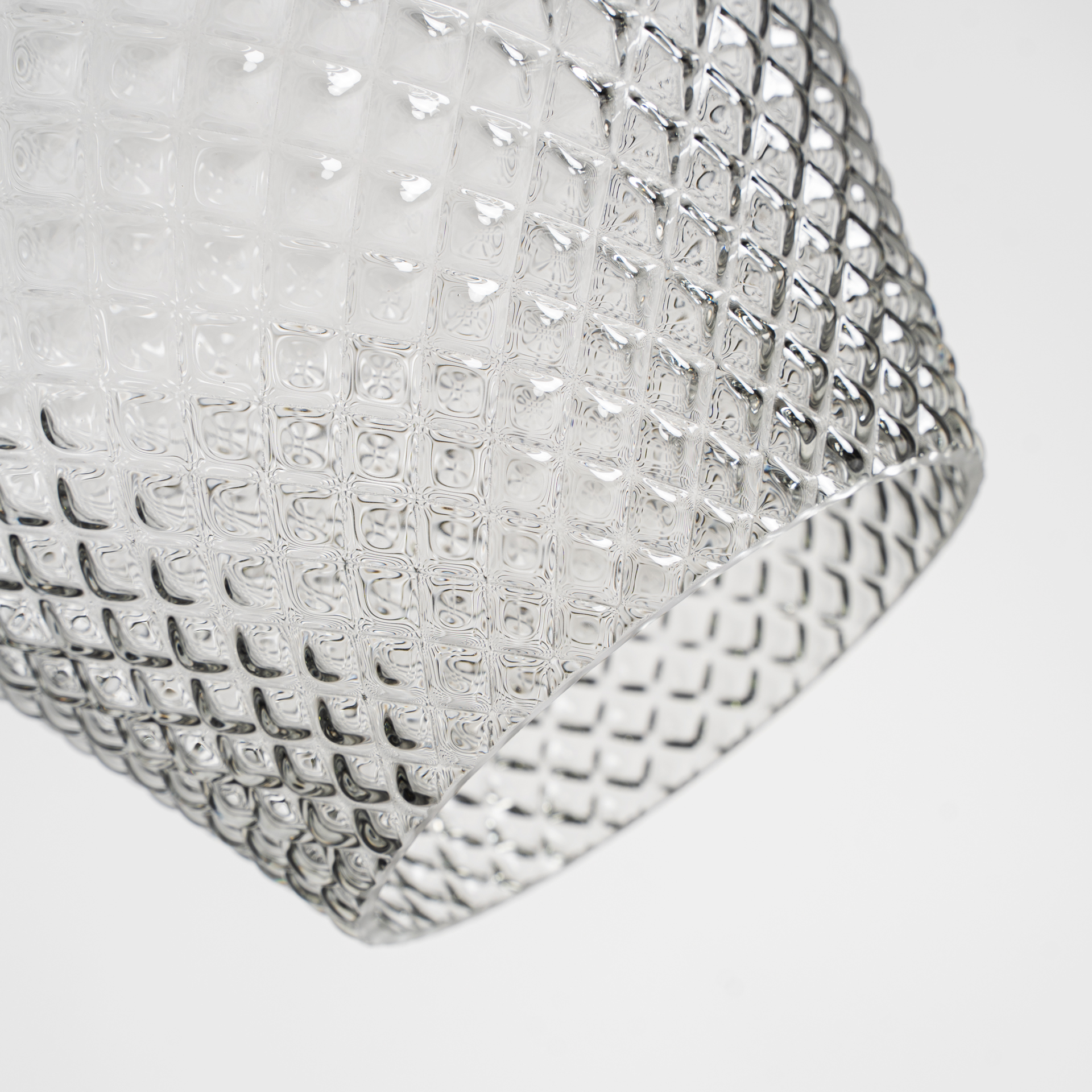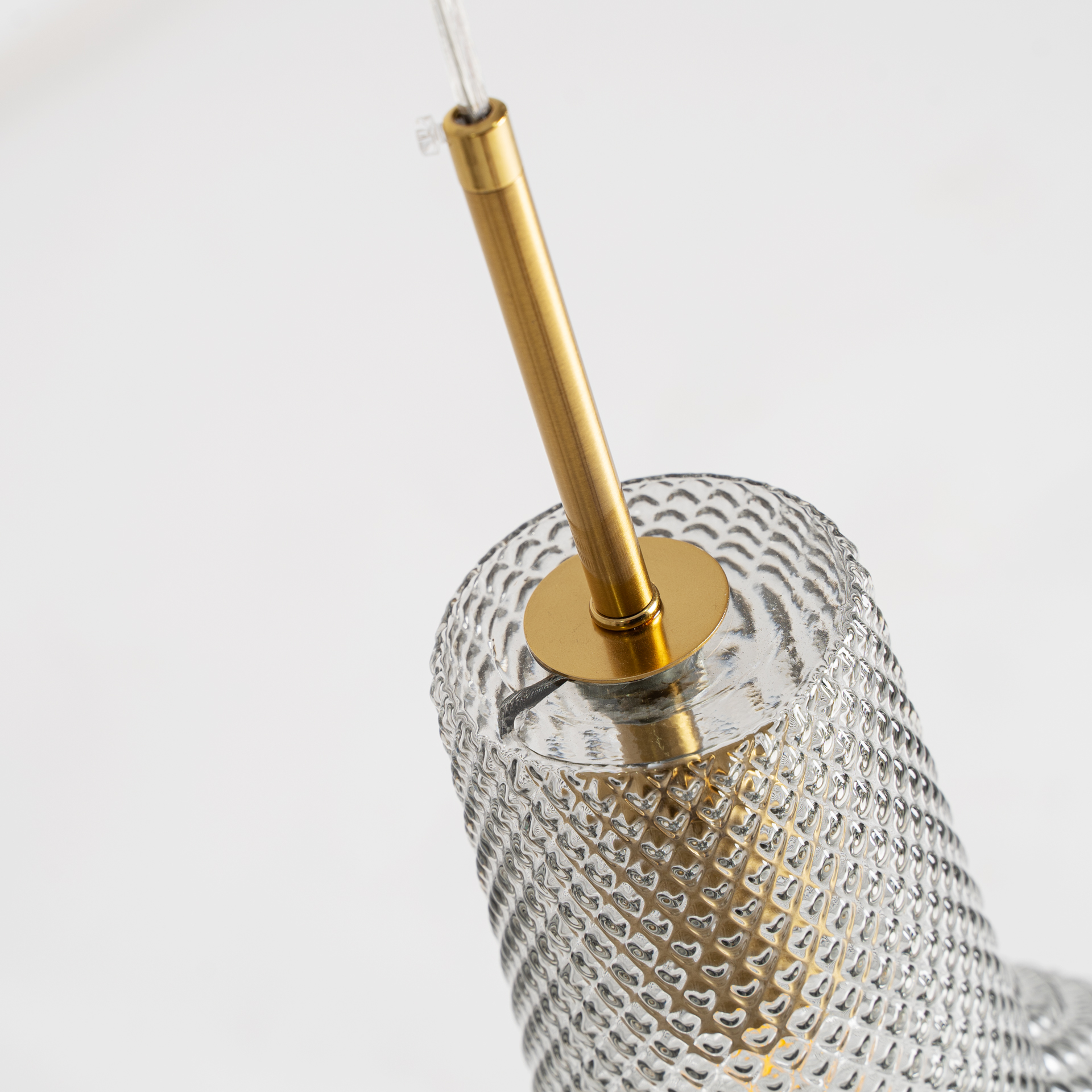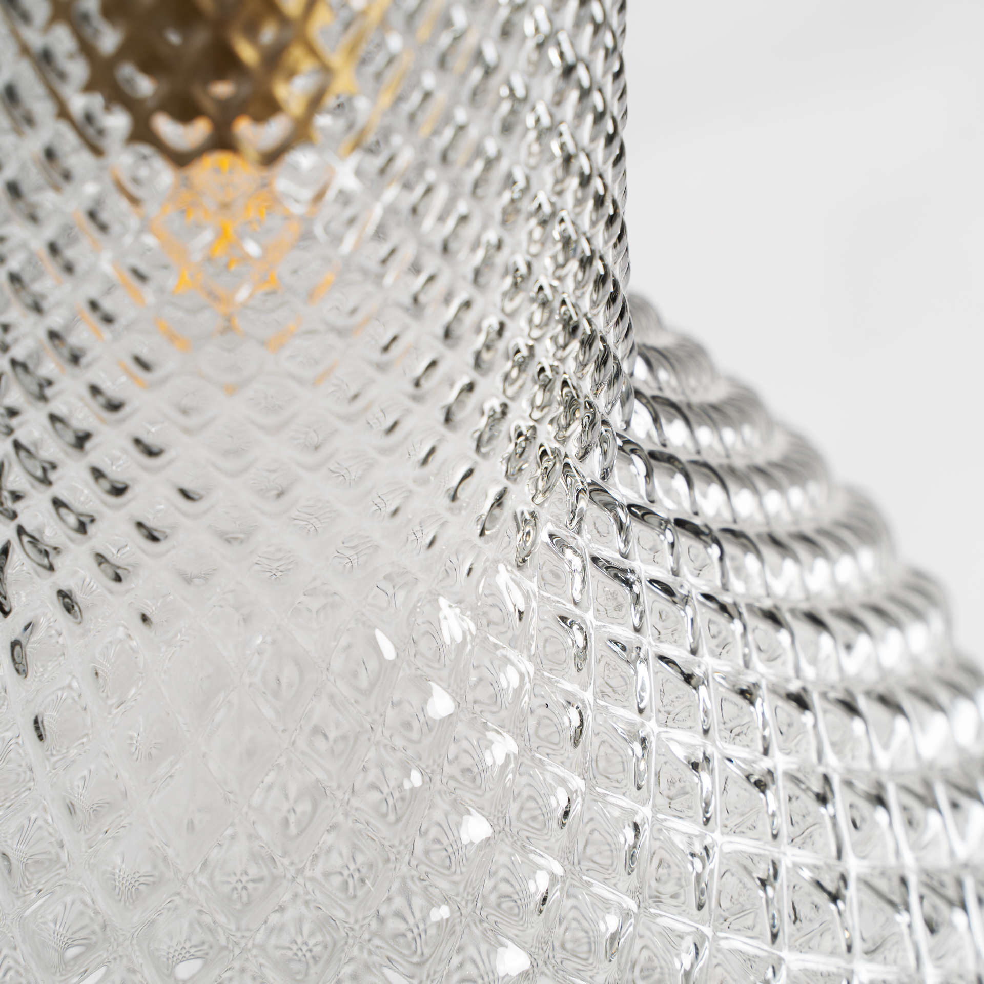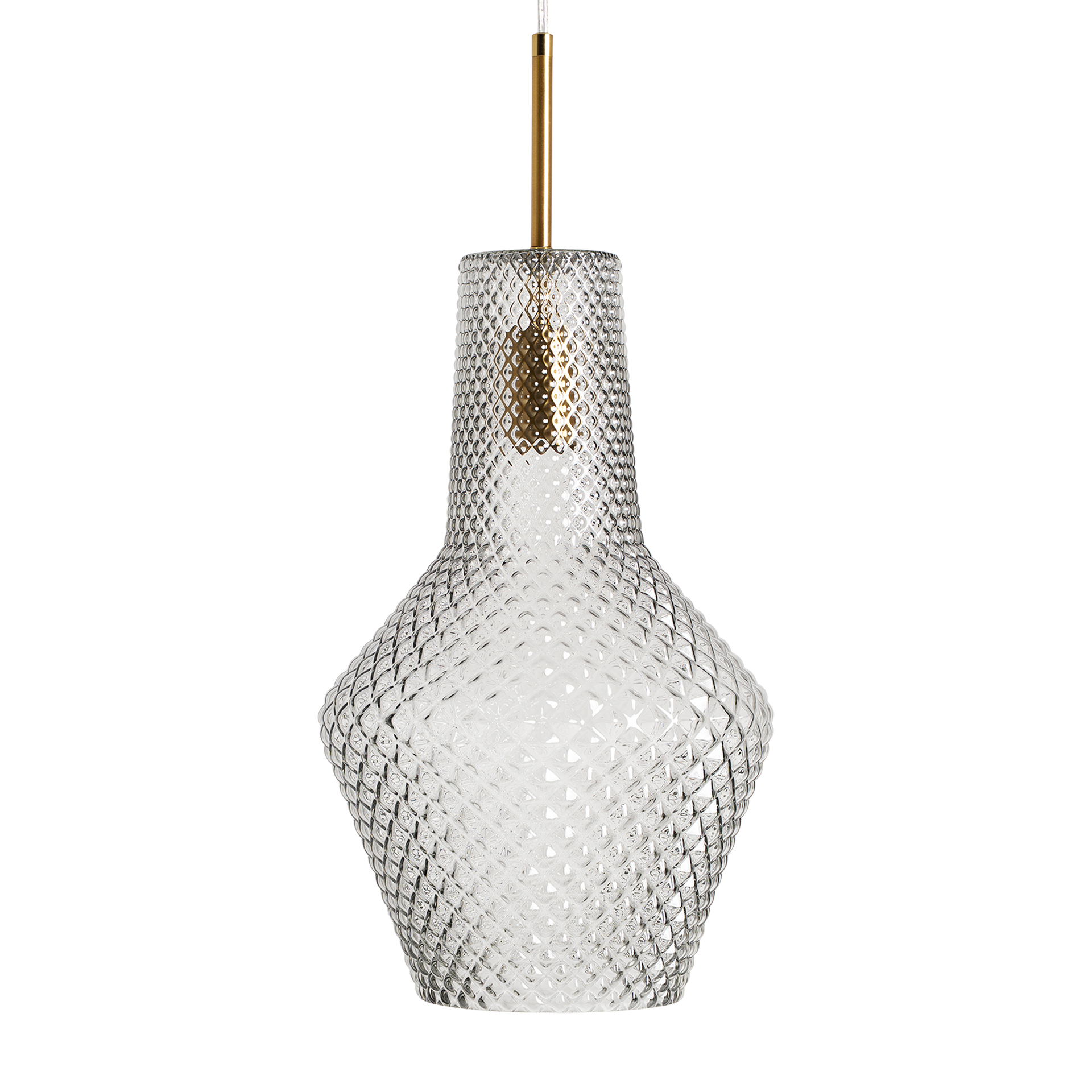Lámpara de colgar Camelia de estilo vintage fabricado en cristal en color transparente con acabado estriado combinado con hierro en color oro. Producto desmontable.