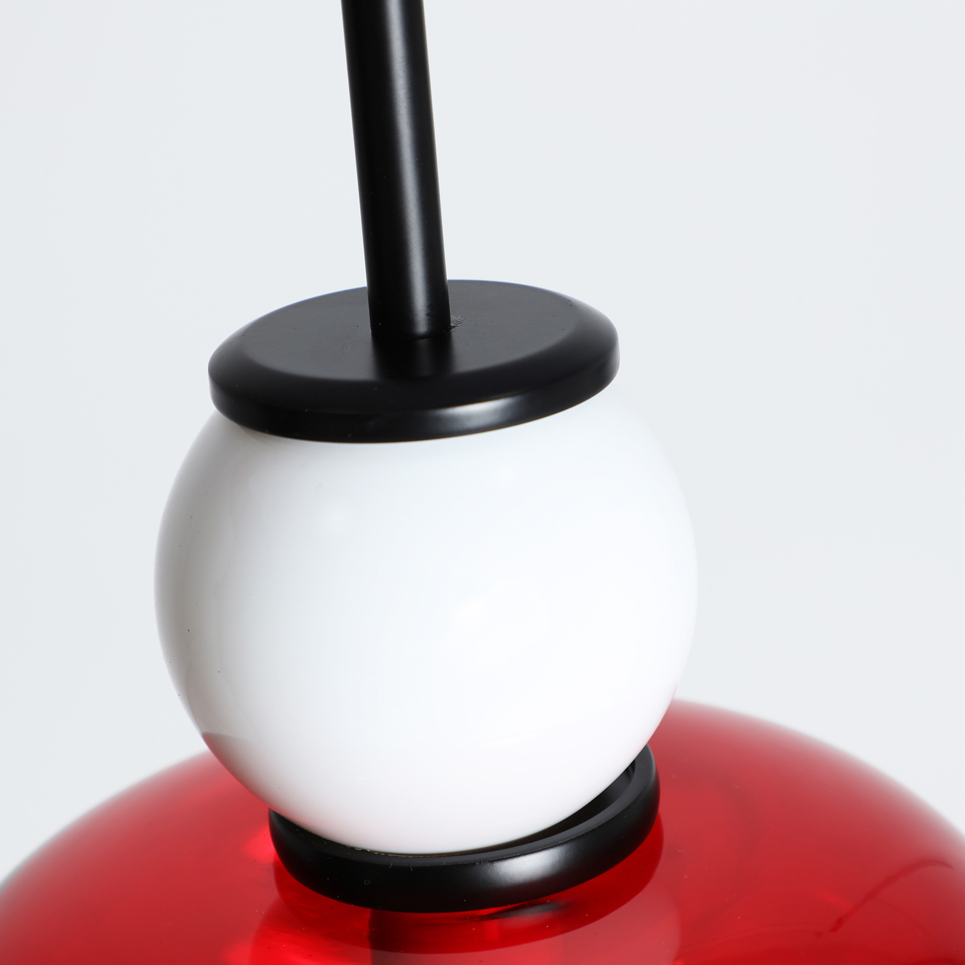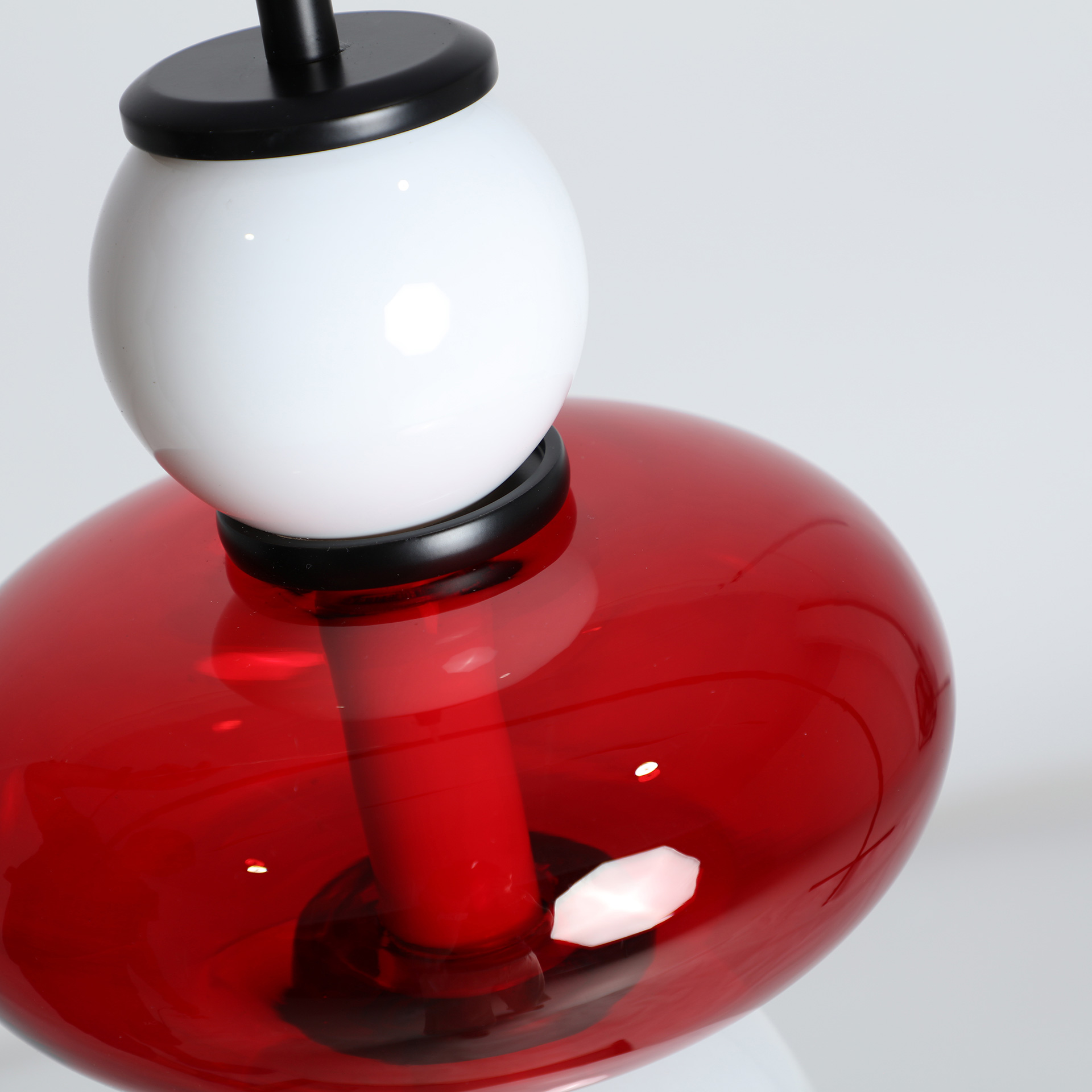 Lámpara de colgar Larisa de estilo contemporáneo, fabricado en cristal en color blanco en color rojo y hierro en color negro. Producto desmontable.