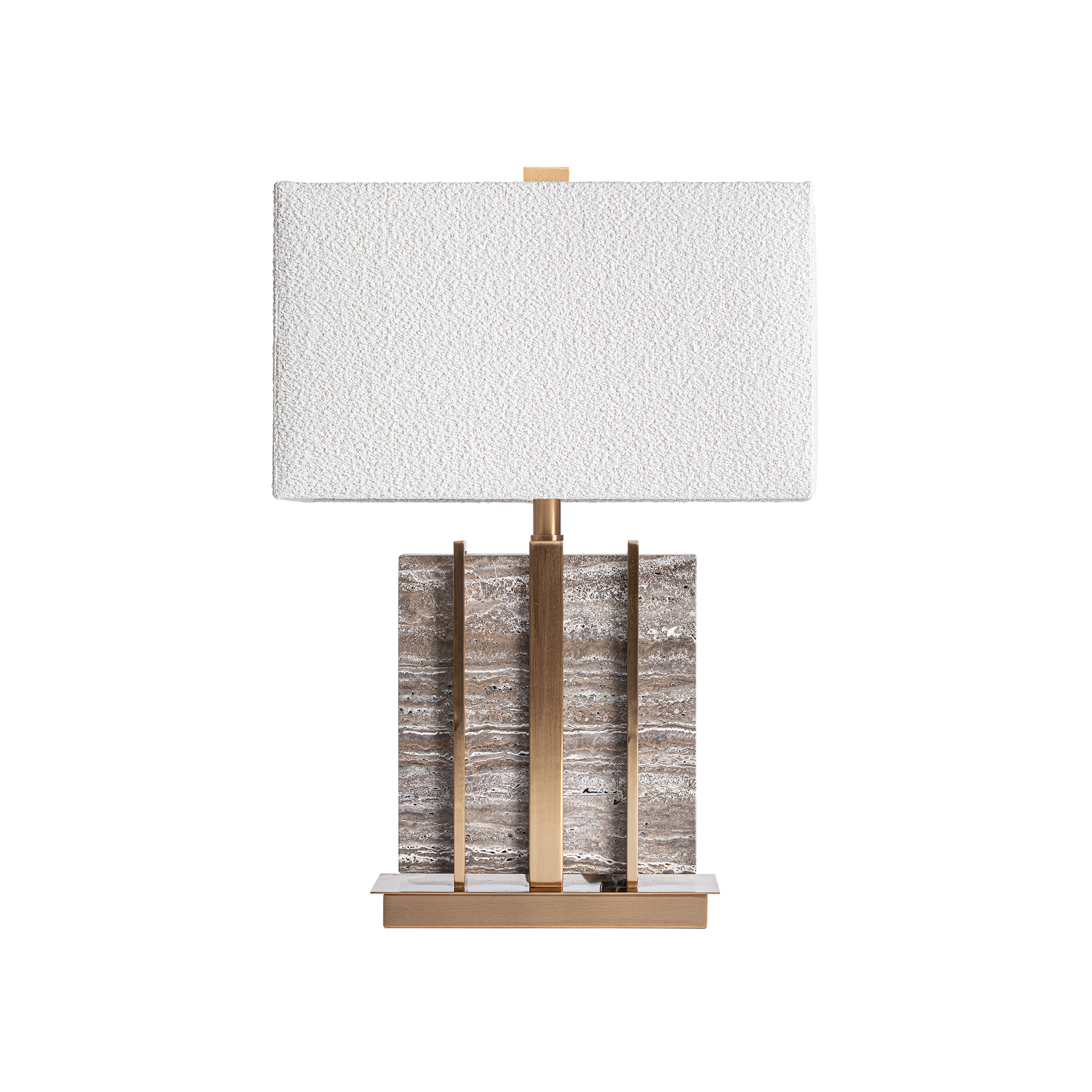 Lámpara de sobremesa Gia de estilo contemporáneo, fabricado en mármol en color gris, combinado con hierro en color dorado y poliéster en color crema. Producto desmontable.