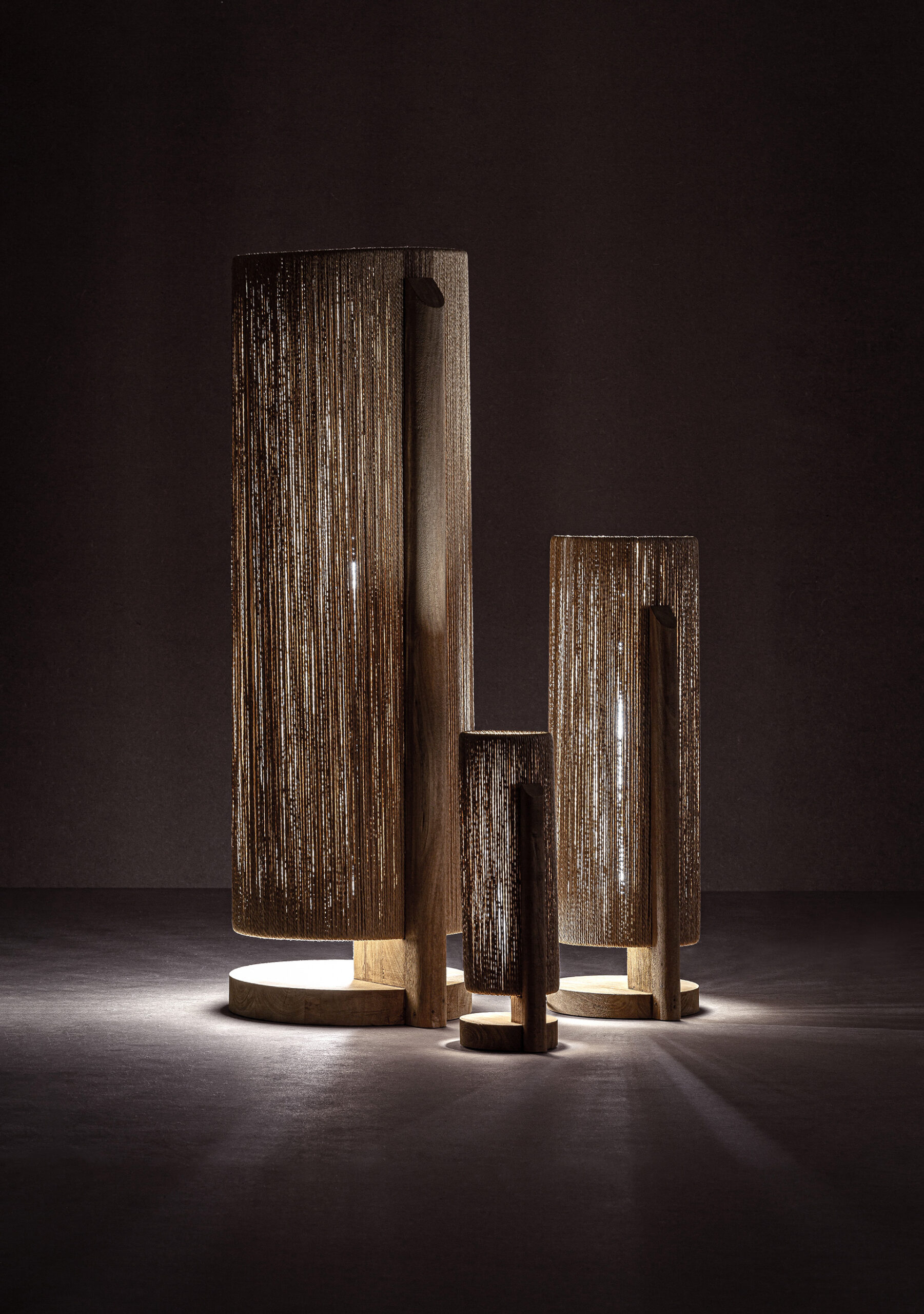 Lámpara de sobremesa jacquard de estilo contemporáneo. Fabricado en madera de mango en color marrón combinado con rafia en color marrón claro.