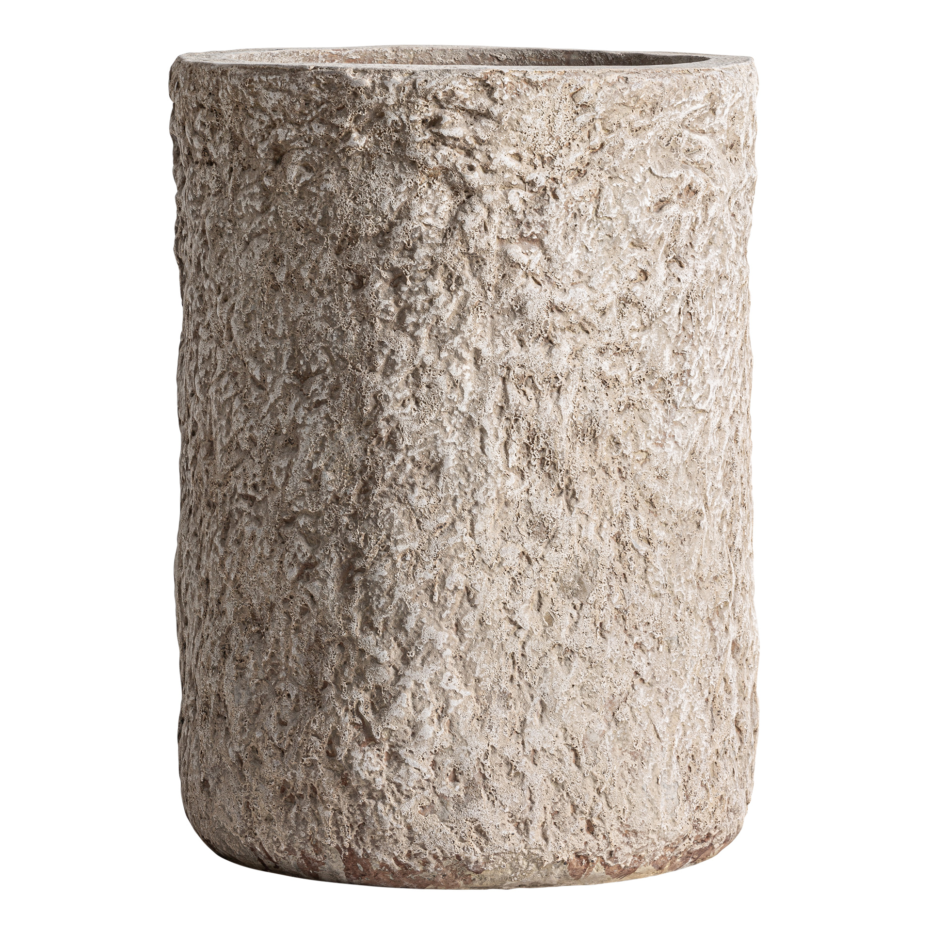 Macetero fabricado en cemento en color blanco combinado con fibra de vidrio.