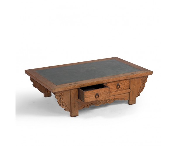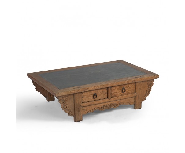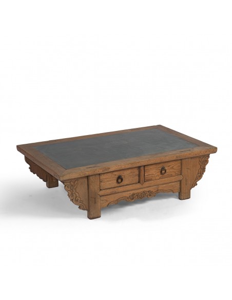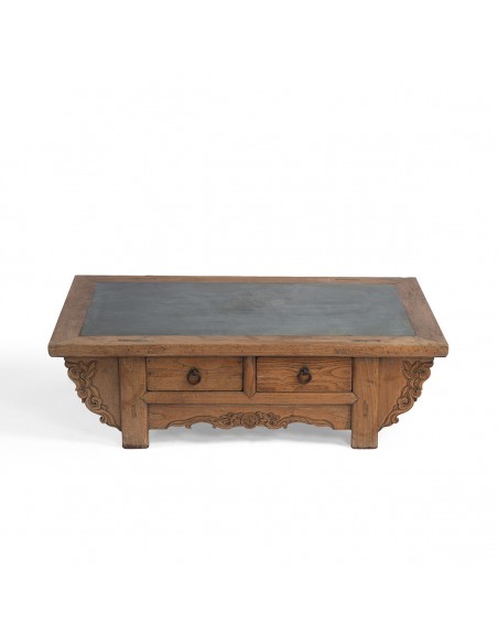 Mesa de centro antigua con encimera de piedra. De estilo oriental esta mesa es perfecta para aportar un toque personal y carácterístico a tu sala de estar o salón. Fabricada en madera y sobre de piedra cuenta con detalles de estilo oriental y dos cajones para pequeño almacenaje.