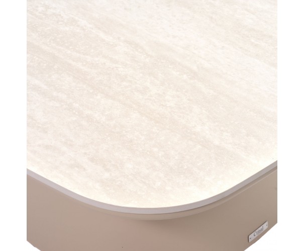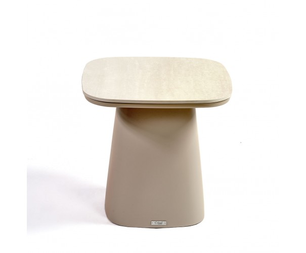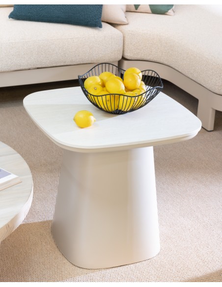Mesa auxiliar para exterior cuadrada con las esquinas redondeadas. Es un diseño de mesa de centro para exterior elegante y sofisticado con tonos neutros con pata color arena y sobre de cerámica color blanco. También disponible en mesa de centro más grande para poner el set.