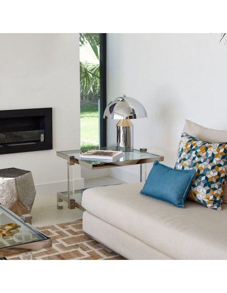 Mesa auxiliar de acero y cristal. Una mesa auxiliar de cristal y acero de diseño, para salones modernos y atrevidos. Esta fantástica mesa ofrece doble tablero de cristal y acero, para poner tus objetos decorativos que más te gusten. Completa la colección con la mesa de centro de acero y cristal de centro. Luminosidad en estado puro. Lineas rectas y elegantes.