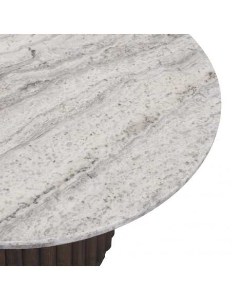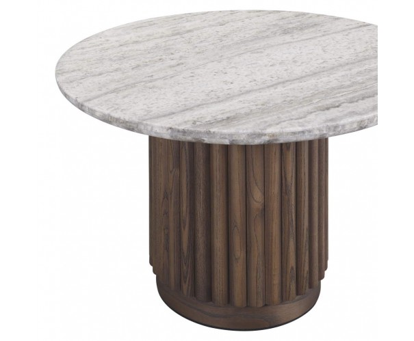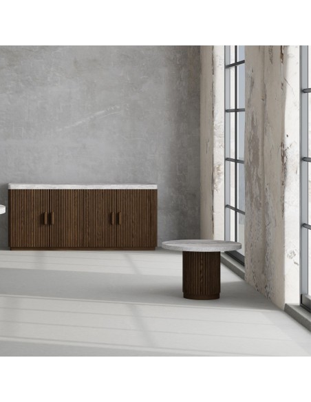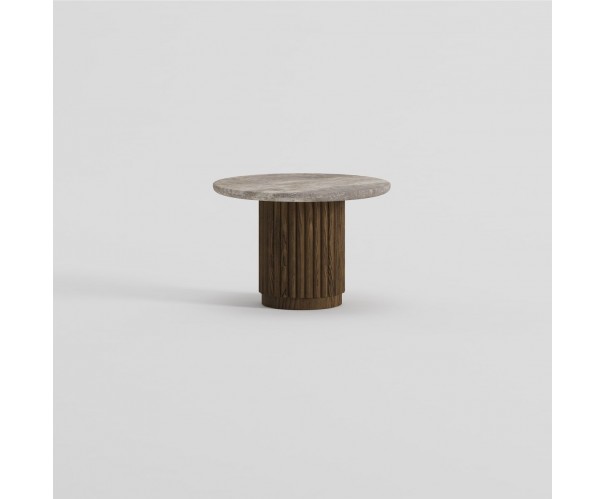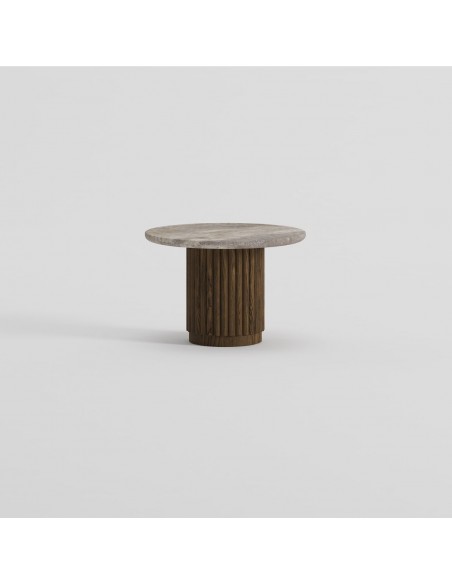 Mesa auxiliar con pata central en palillería color café y sobre de travertino gris mate.