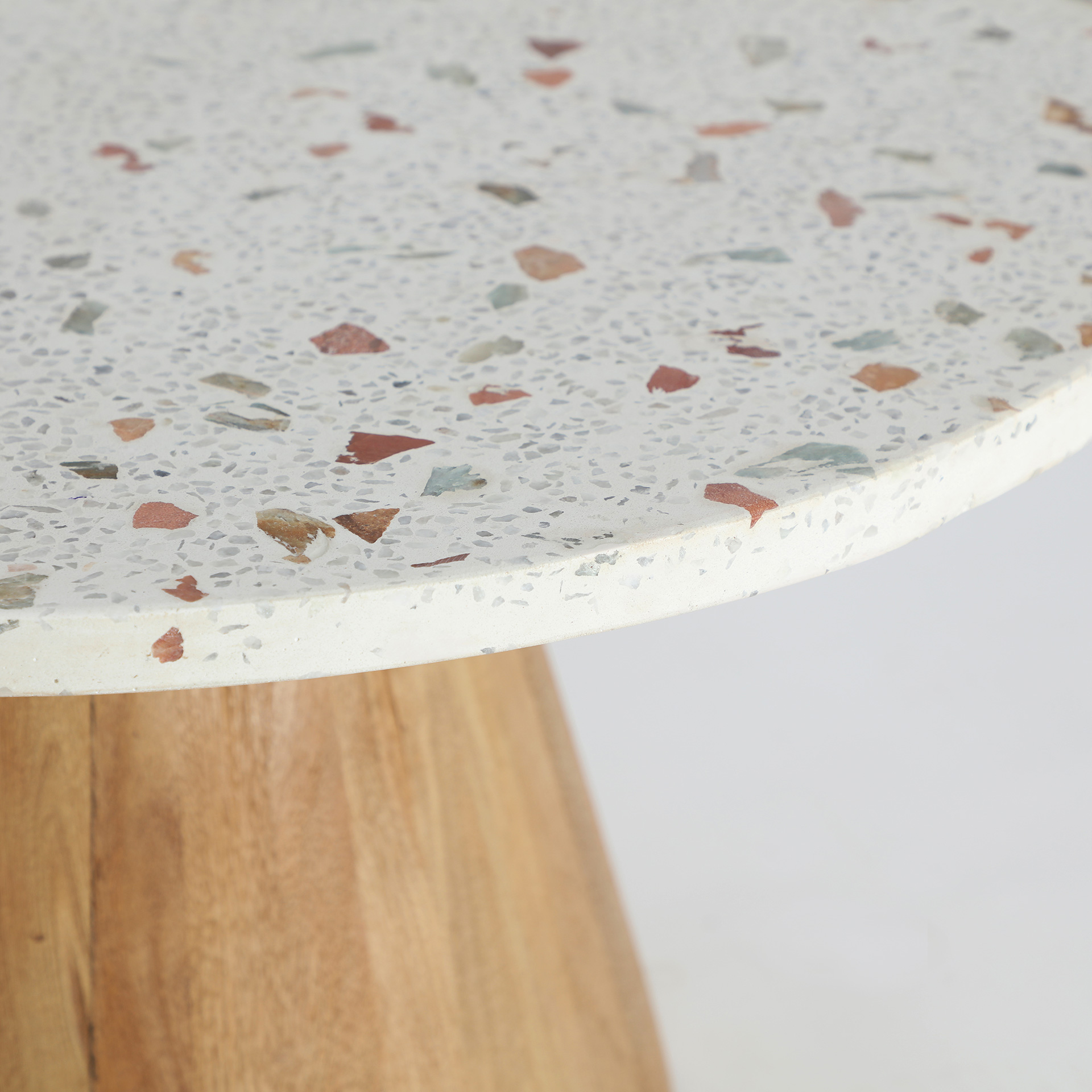 Mesa auxiliar Lautrec de estilo nórdico, fabricado en terrazo en color blanco, combinado con madera de mango en color marrón. Producto desmontable.