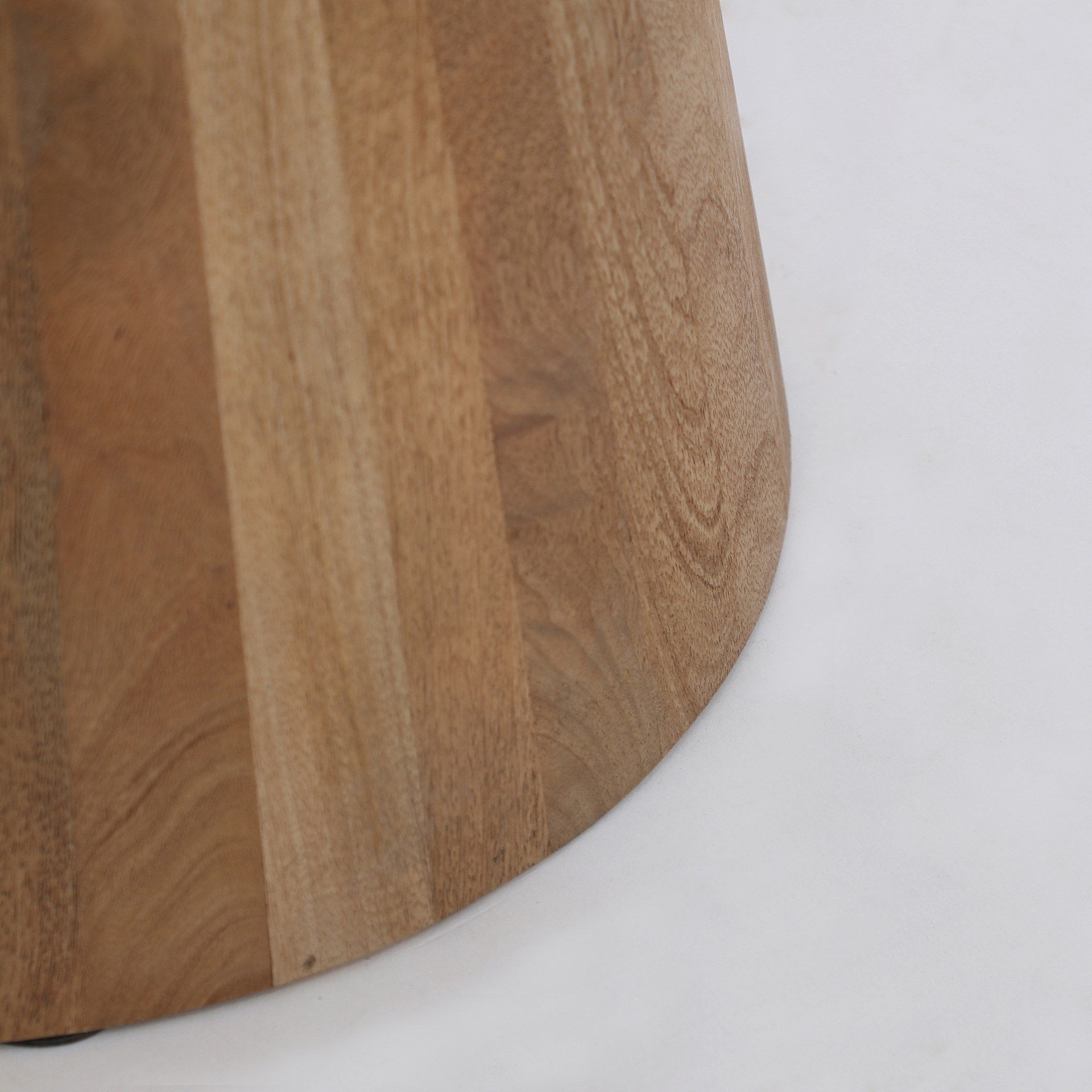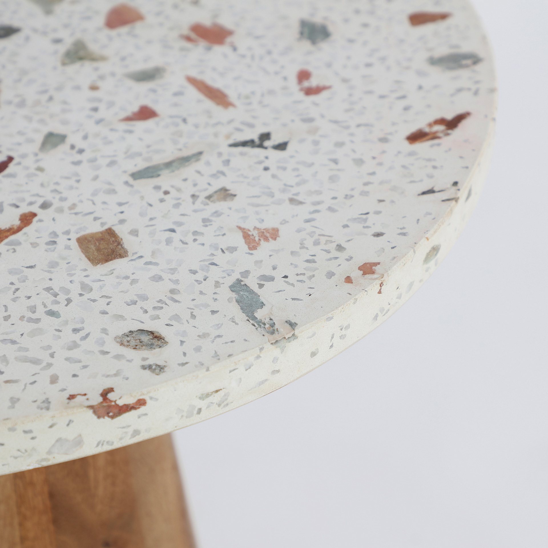 Mesa auxiliar Lautrec de estilo nórdico, fabricado en terrazo en color blanco, combinado con madera de mango en color marrón. Producto desmontable.