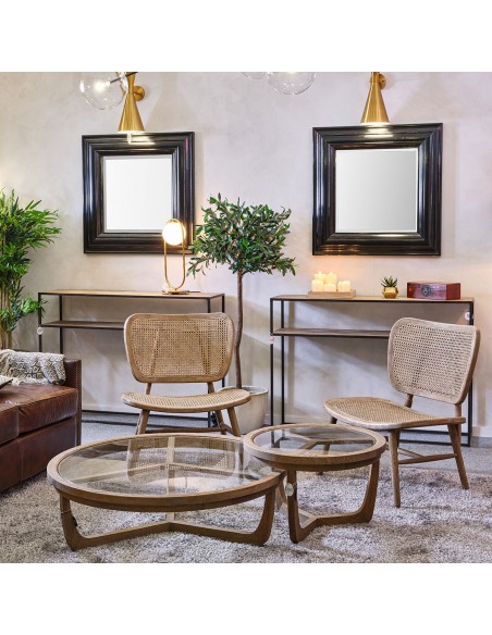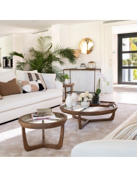 Mesa auxiliar redonda con estructura de madera de roble en color natural con pátina grisácea y sobre de cristal transparente. Deja ver la estructura de las patas y aporta ligereza a la pieza. Combinable con otros modelos de la serie ARIANA.