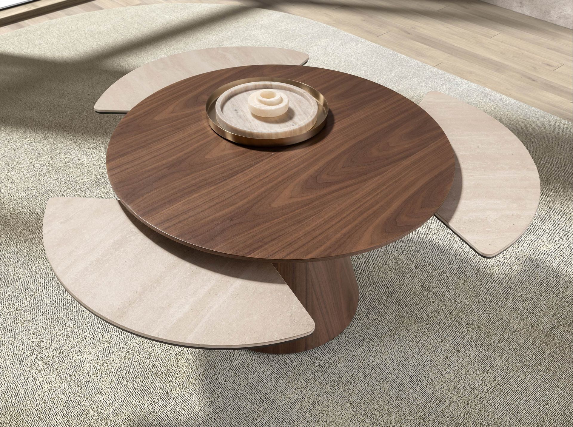 Mesa centro extensible redonda nogal y mármol porcelánico
