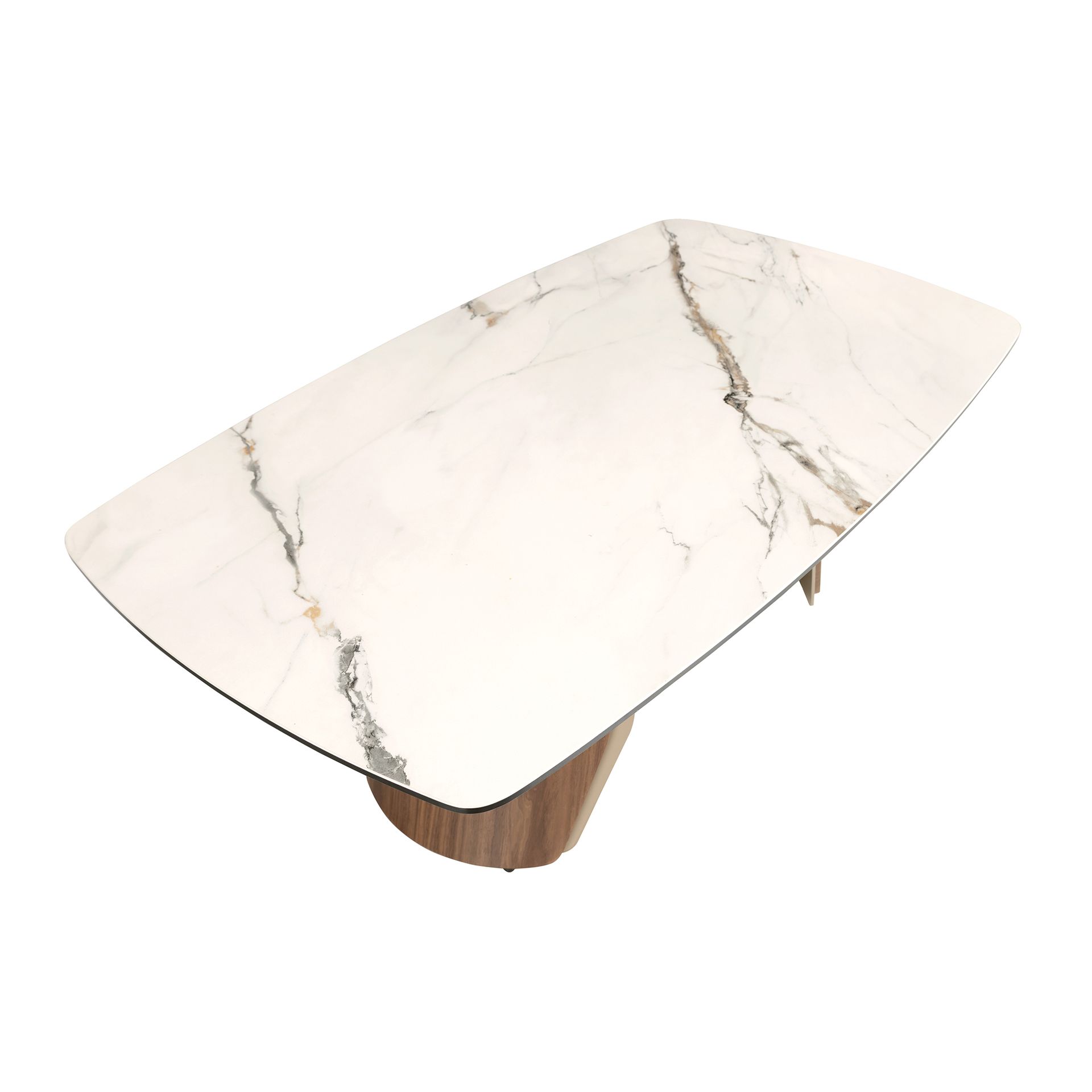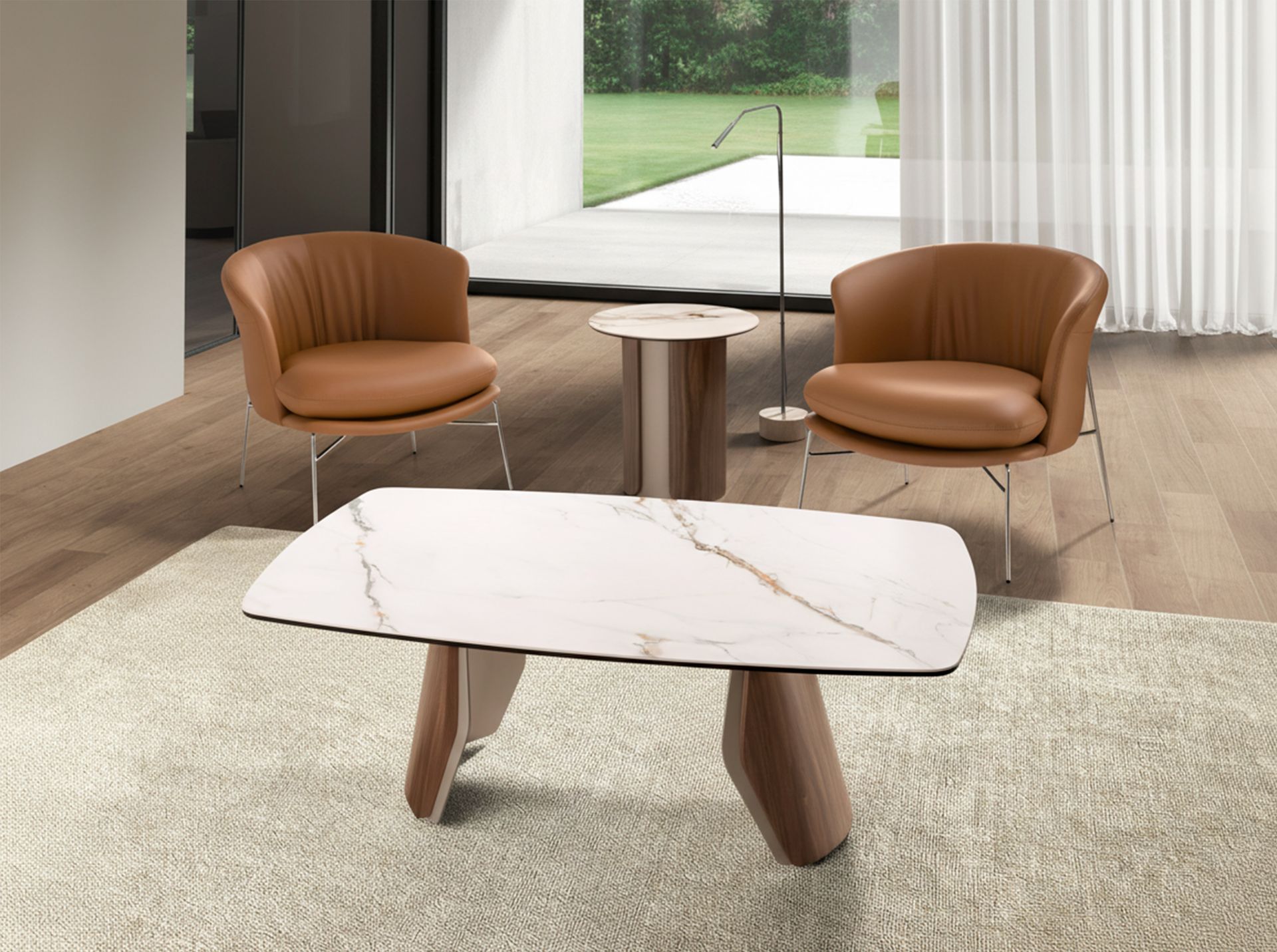 Mesa centro ovalada barril mármol porcelánico, acero arena metalizado y nogal