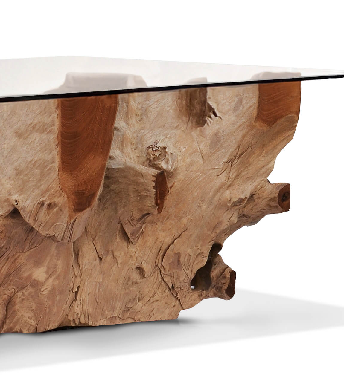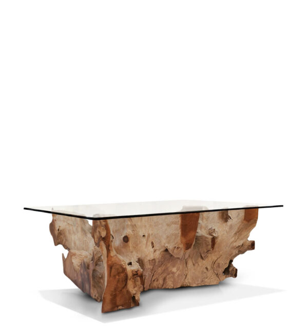 Mesa centro raiz teka blanqueada con cristal 120*75*45