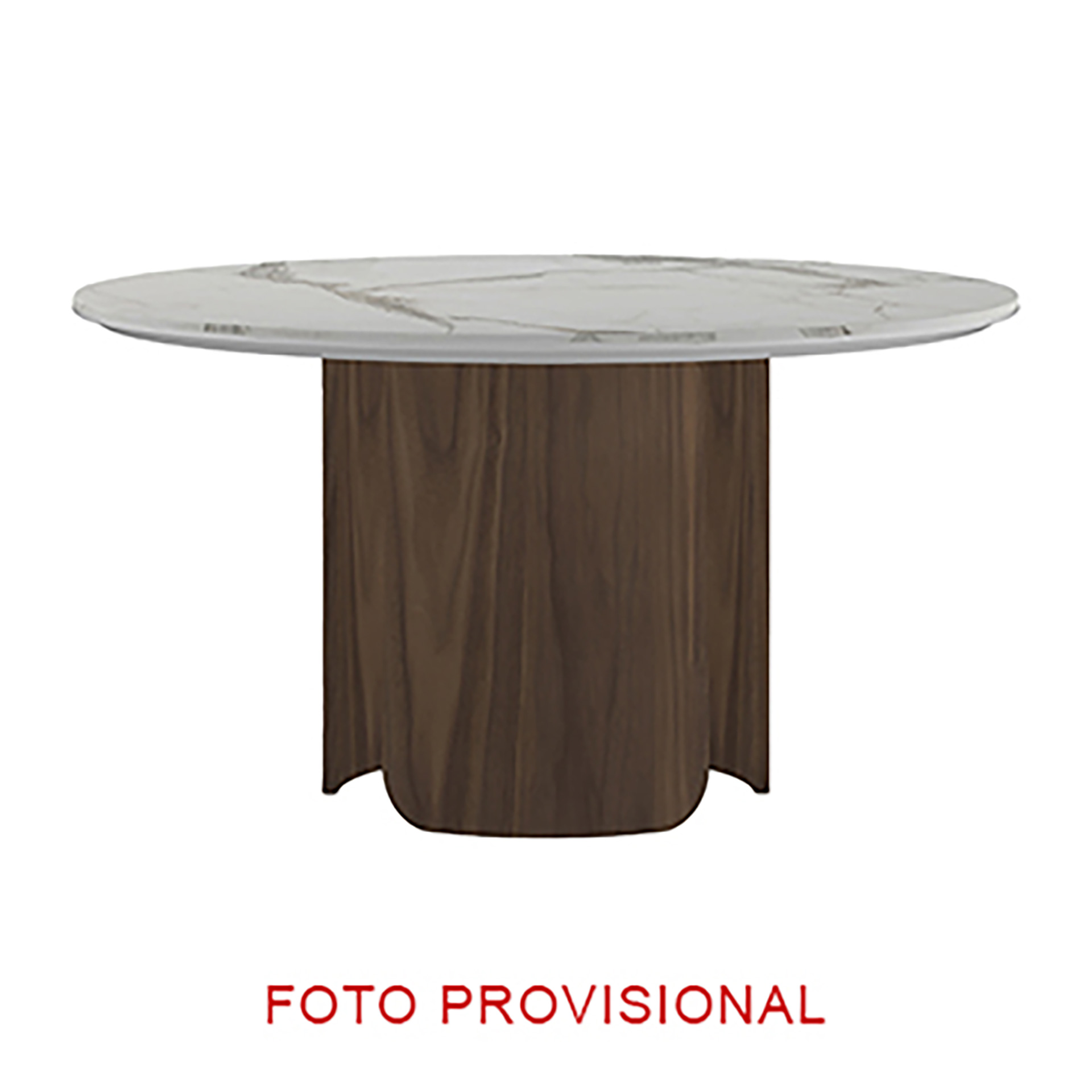 Mesa comedor fabricado en porcelánico en color blanco combinado con madera contrachapada en color marrón.