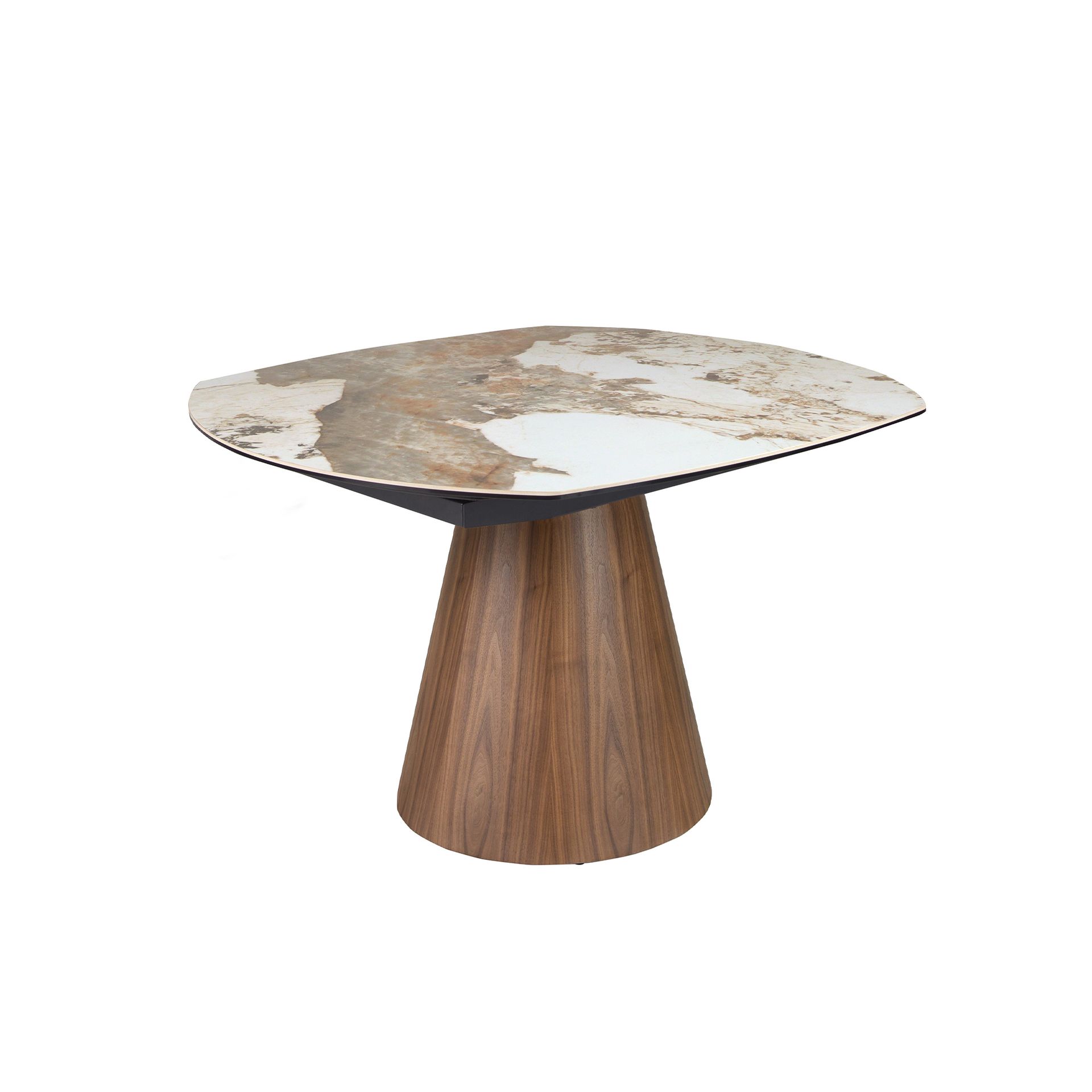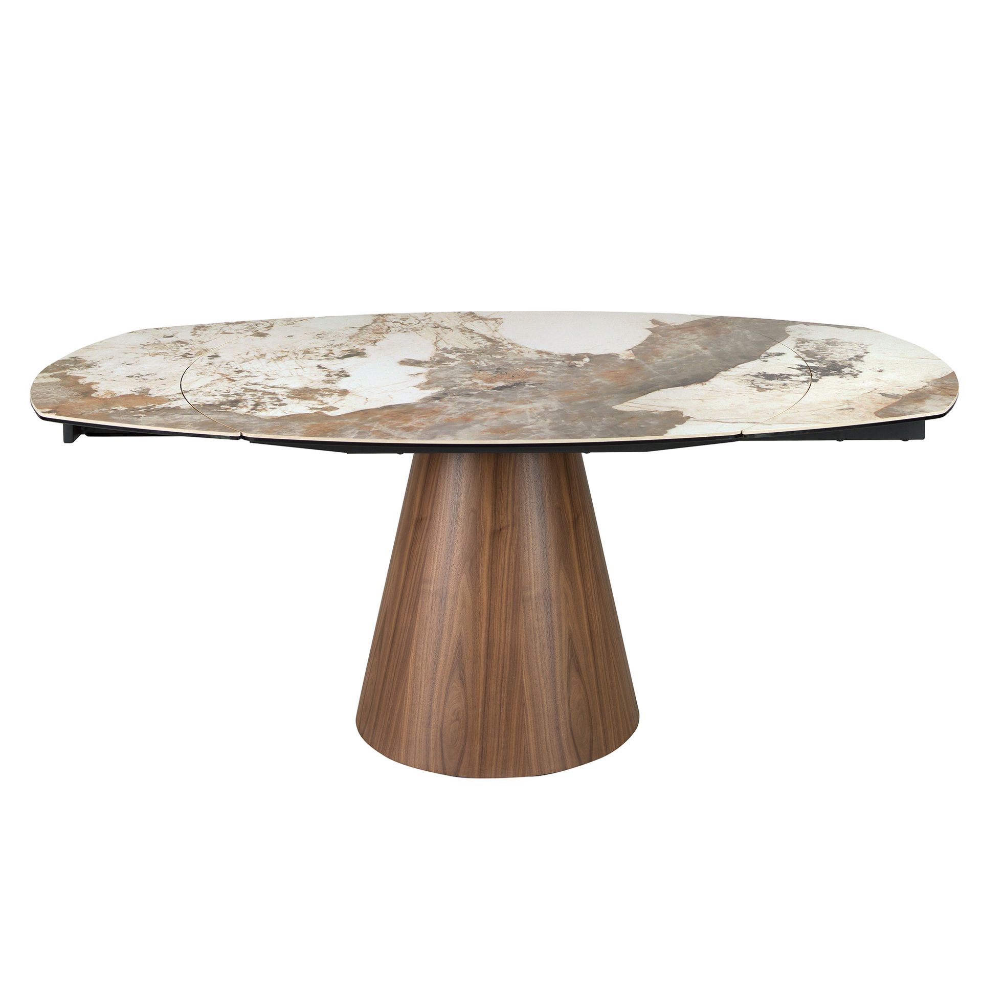 Mesa comedor extensible ovalada barril mármol porcelánico y nogal