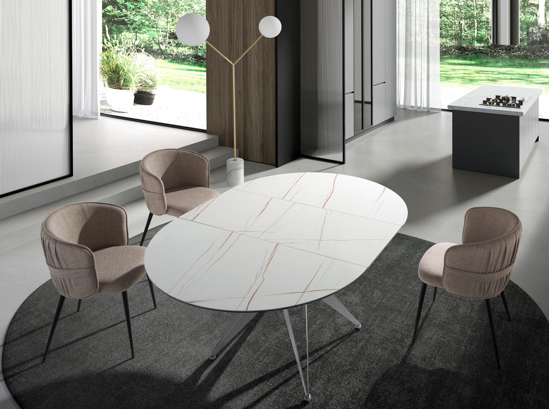 Mesa comedor extensible redonda mármol porcelánico y acero gris